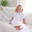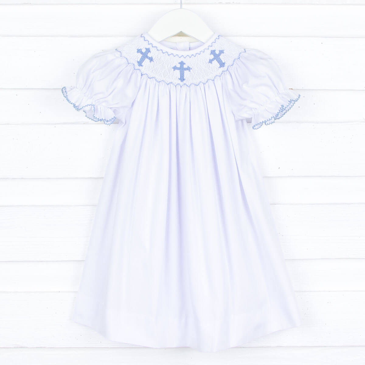 Make sure your little angel is stunning on her Christening Day, for an Easter celebration or any special day at church! Features hand-smocked blue crosses along the neckline on a solid white pique fabric. Also features cute bishop sleeves with light blue trim.