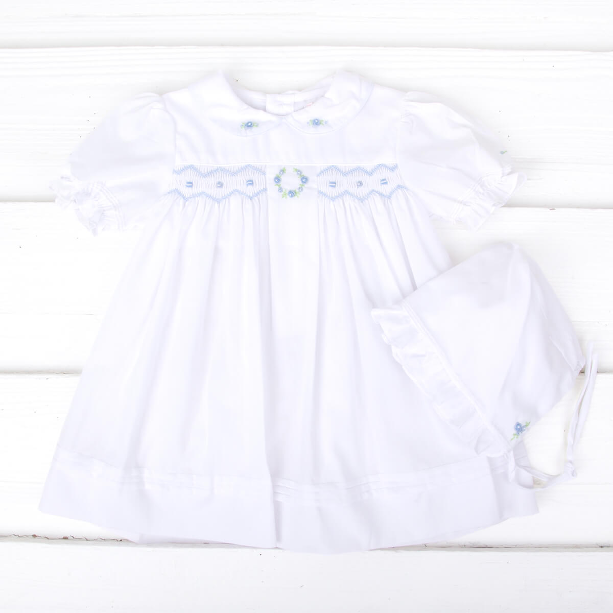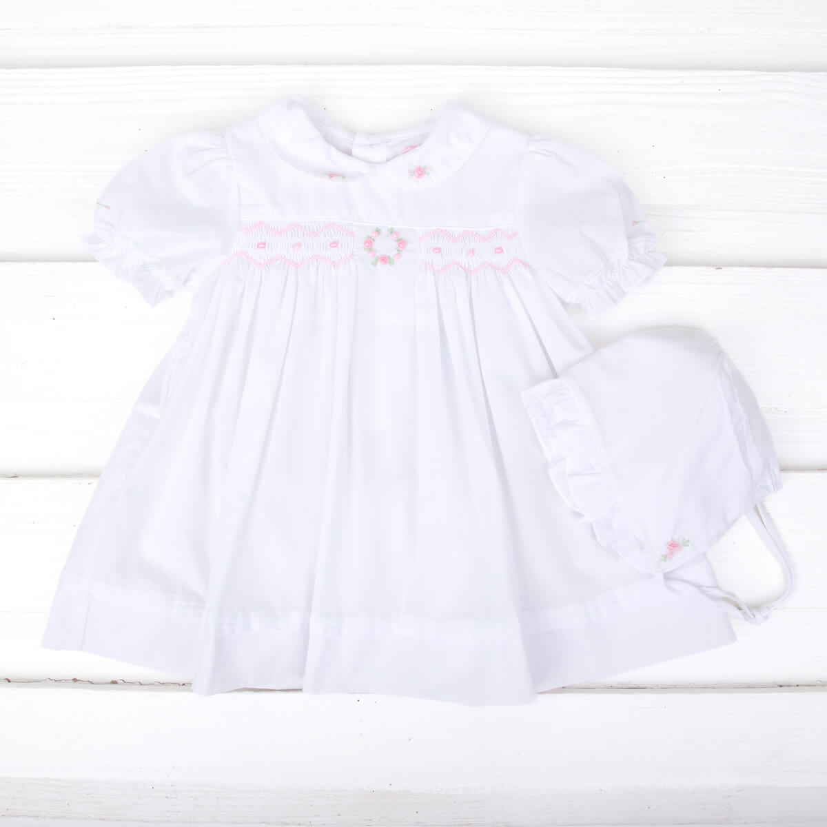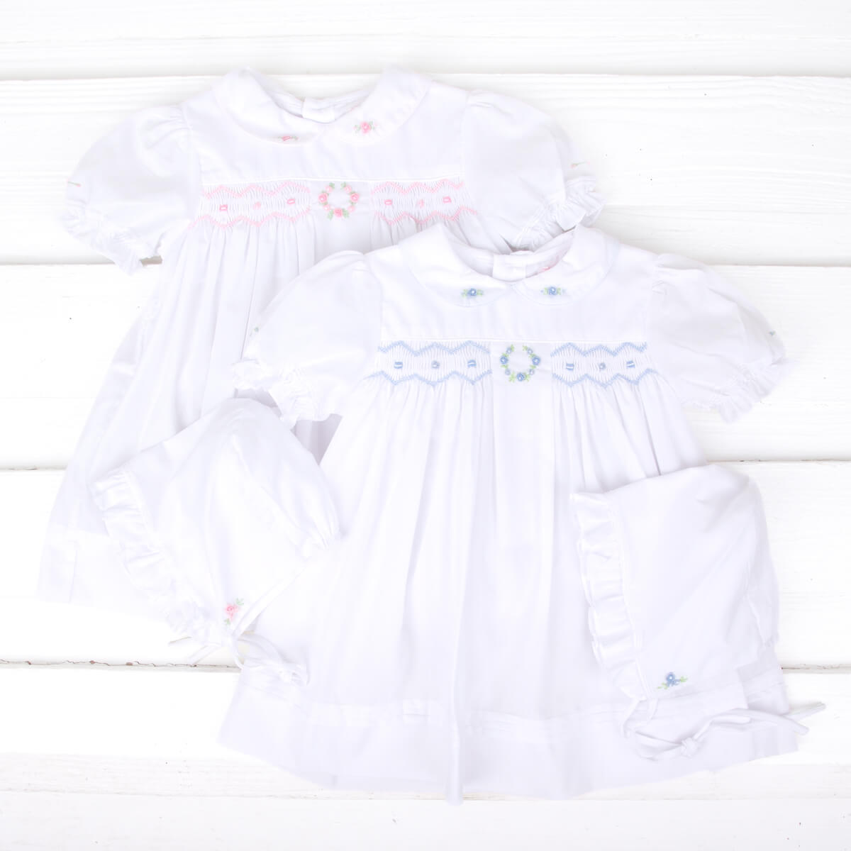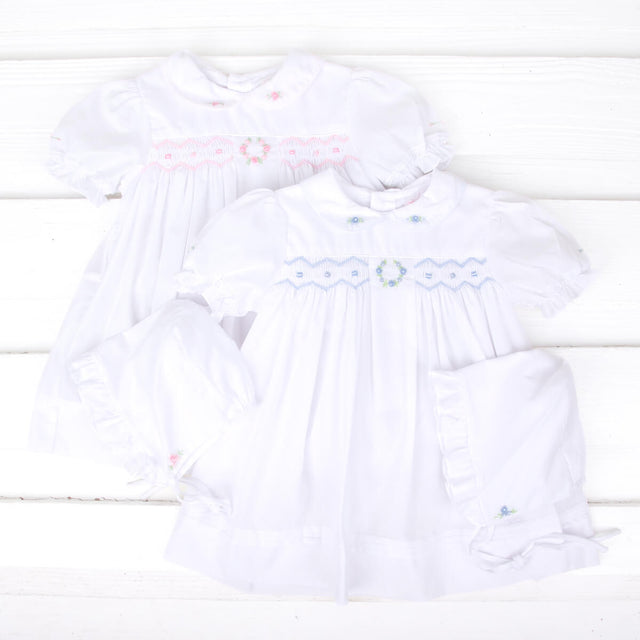 Your little one will look precious in this Smocked Rosebud Bishop White Dress. This charming white dress comes with two lovely smocking options: pink or light blue, both perfect for any special occasion!