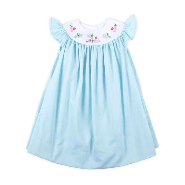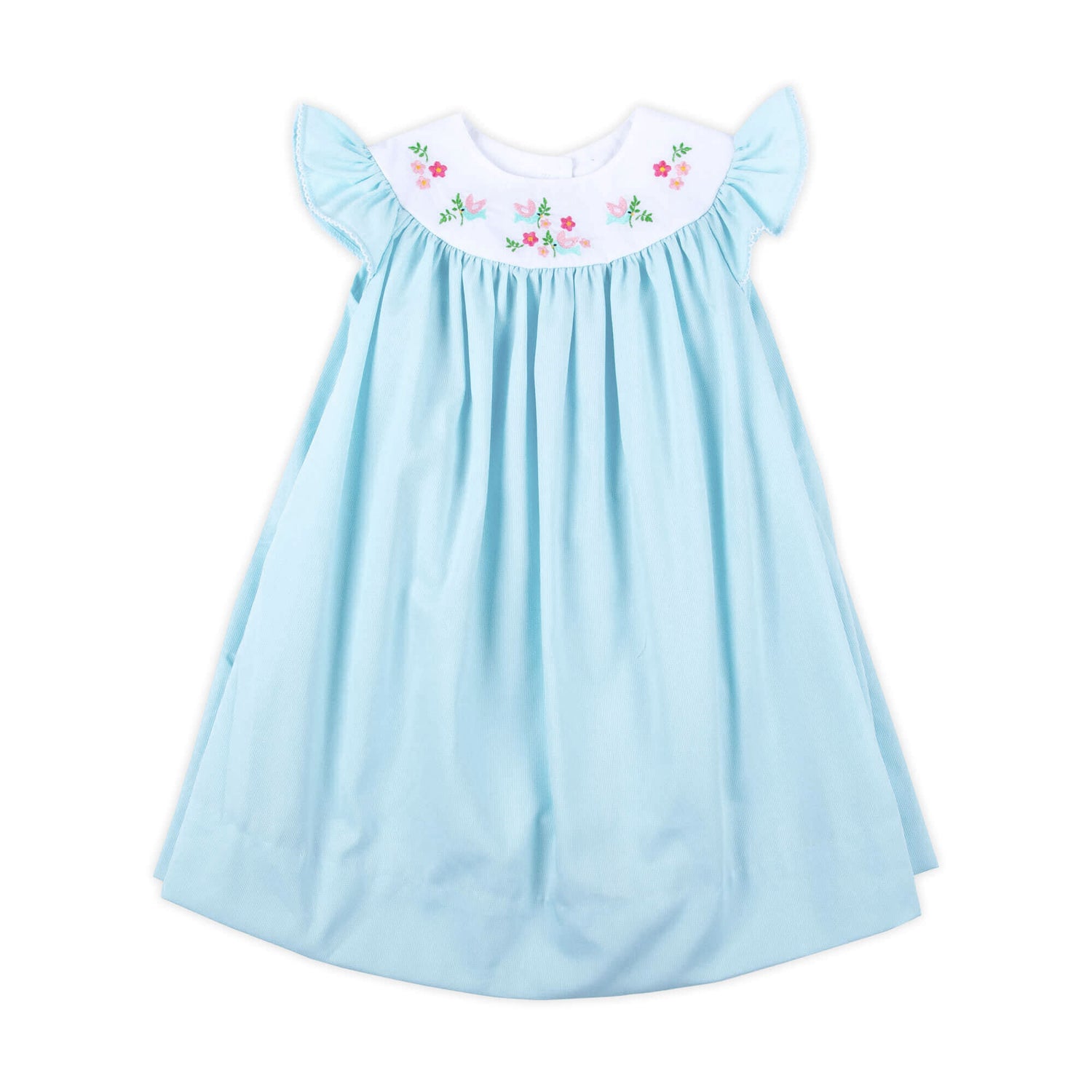 Your little chickadee will look oh so sweet in our Embroidered Sweet Bird Yoke Neck Dress Mint Pique. This adorable dress features a yoke neck adorned with embroidered birds and flowers