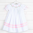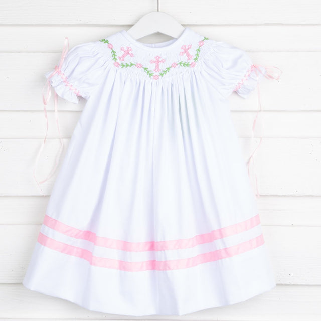 This special dress features sweet light pink cross smocking and delicate floral details, making it an ideal choice for your little girl's Easter or baptism outfit! The dress also features sweet bishop sleeves adorned with pink ribbon detail, adding an extra touch of charm to this outfit.