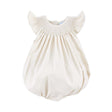 The Geo Smocked Tan Gingham Angel Sleeve Bubble is a timeless choice for family beach portraits and warm-weather gatherings. Featuring classic tan gingham, elegant geometric smocking, and flutter angel sleeves finished with white ric-rac trim, this darling style blends coastal charm with traditional detail. Snaps in stride for easy changes.