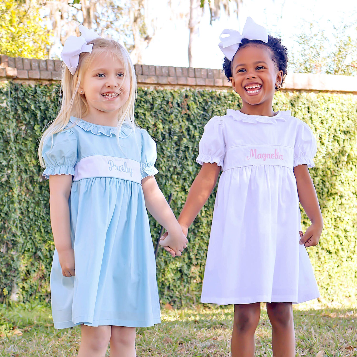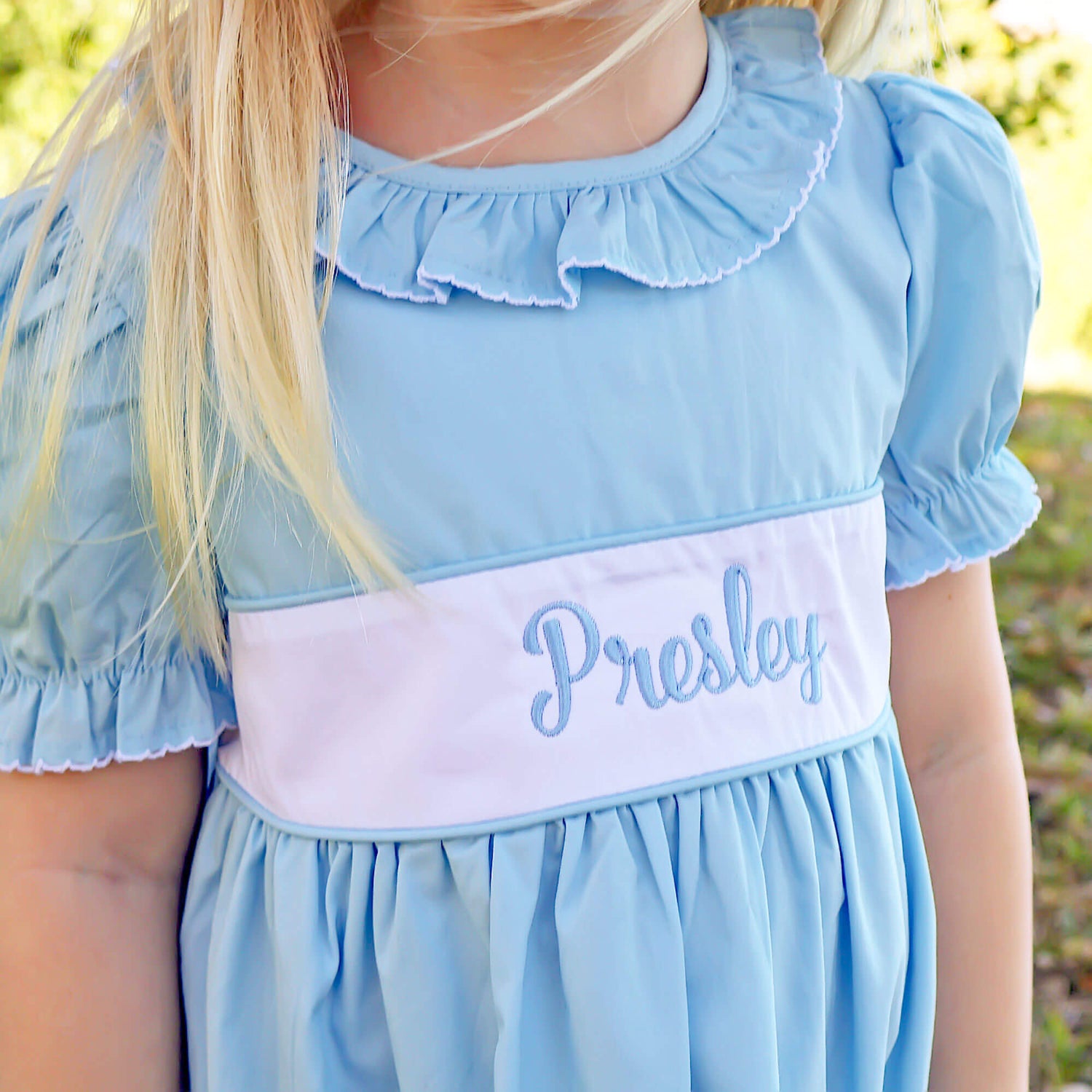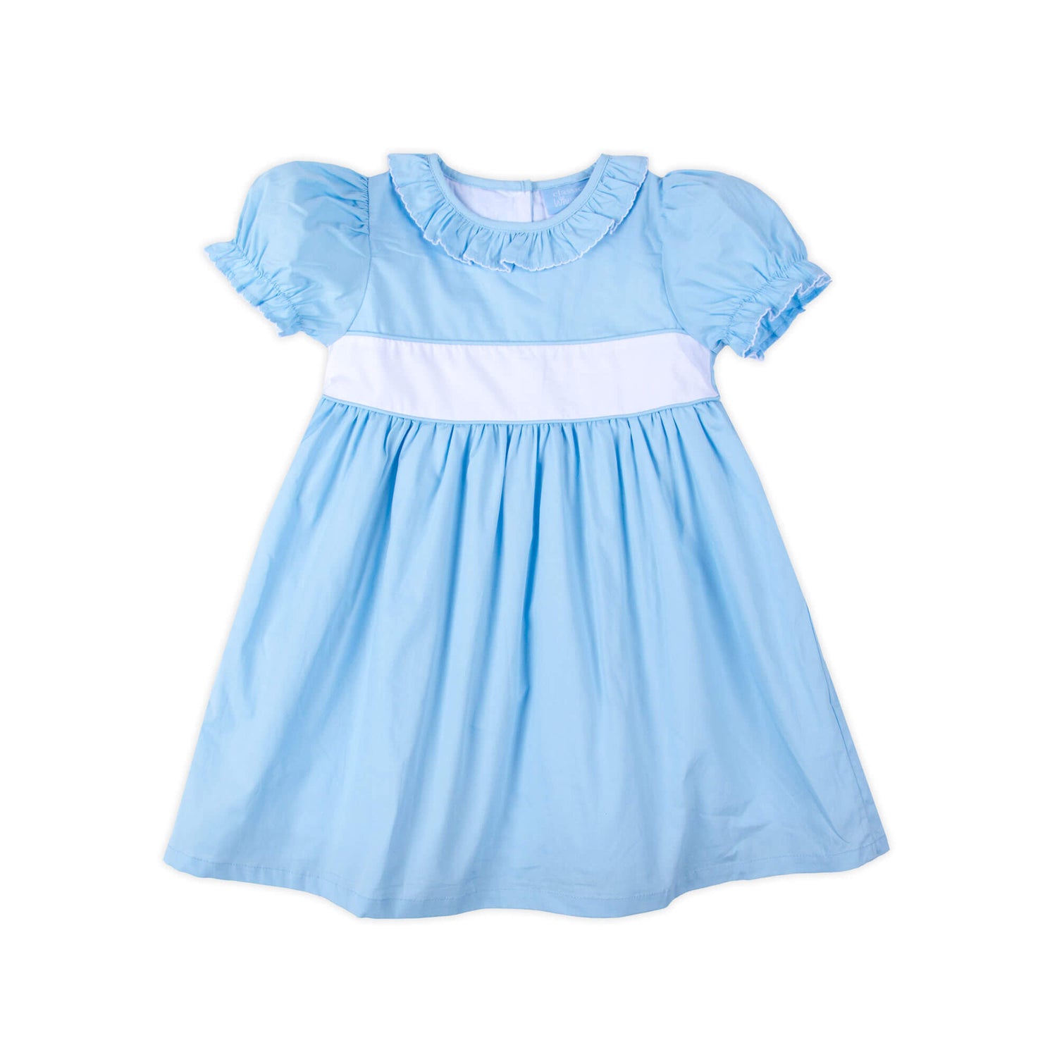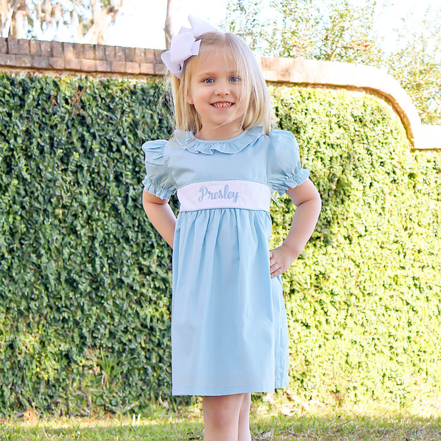 Elevate your little one's spring and summer wardrobe with our enchanting Light Blue Ruffle Collared Dress. This delightful light blue dress is perfect for special occasions while adding a touch of charm to everyday moments. Made from solid light blue fabric, it features a ruffle collar and bishop sleeves that create a whimsical and stylish look. Add a monogram for a personalized touch to make this dress truly unique.