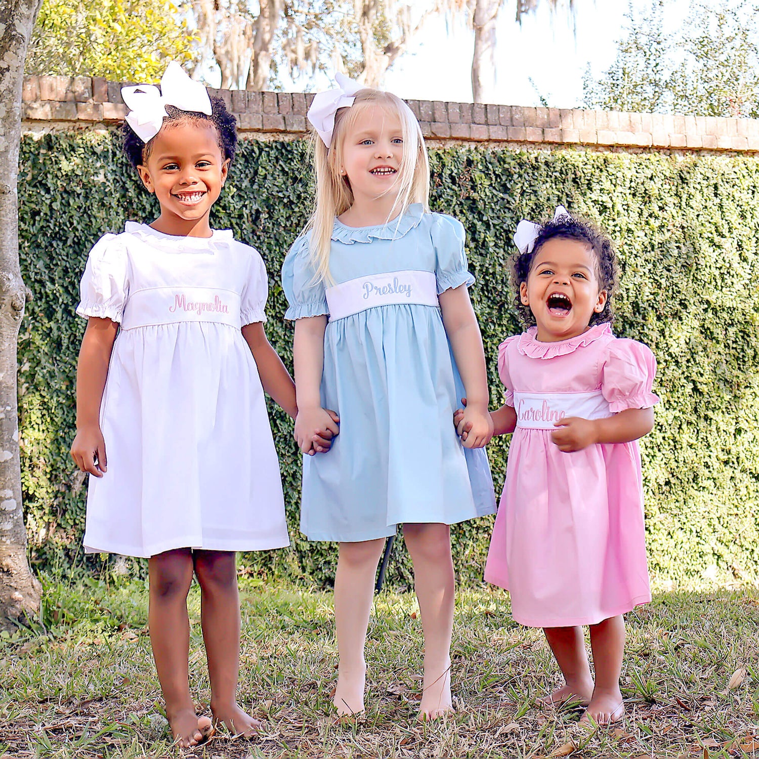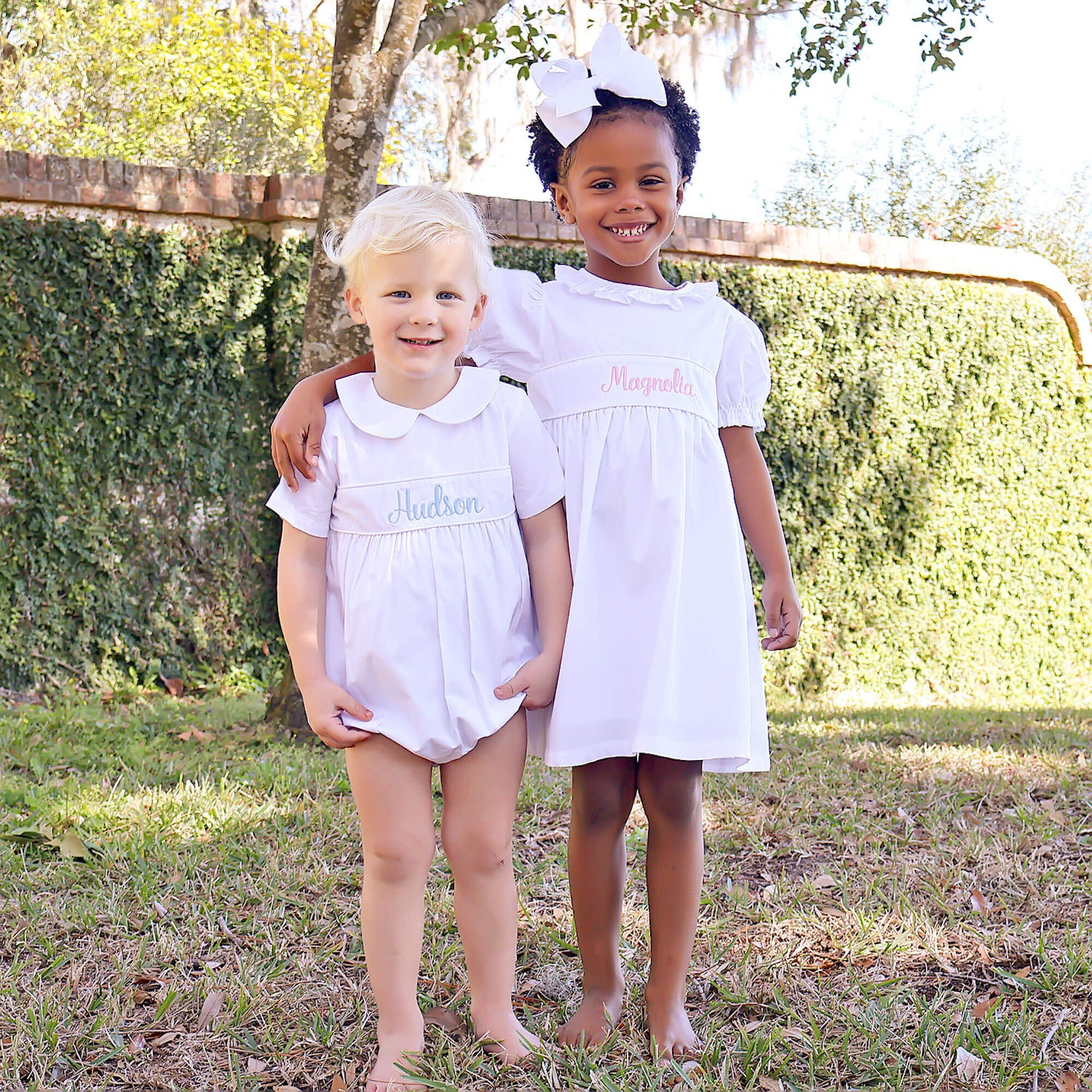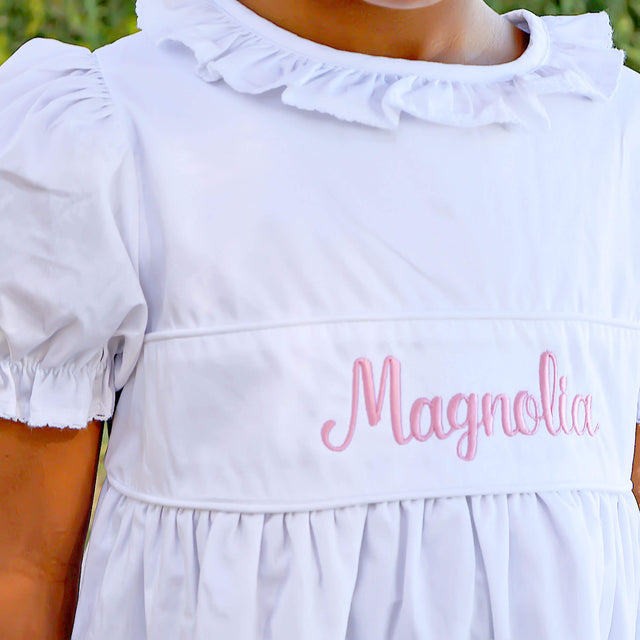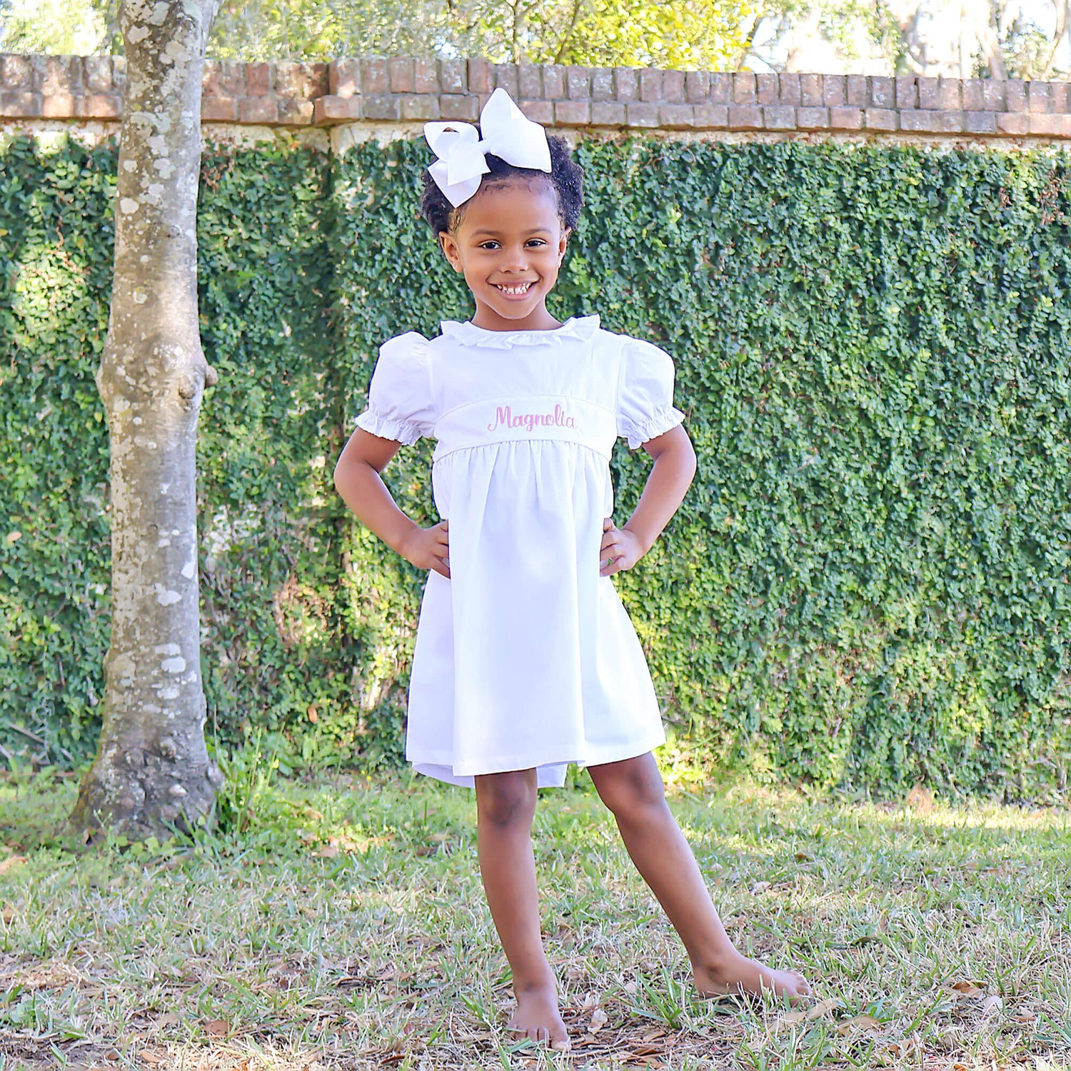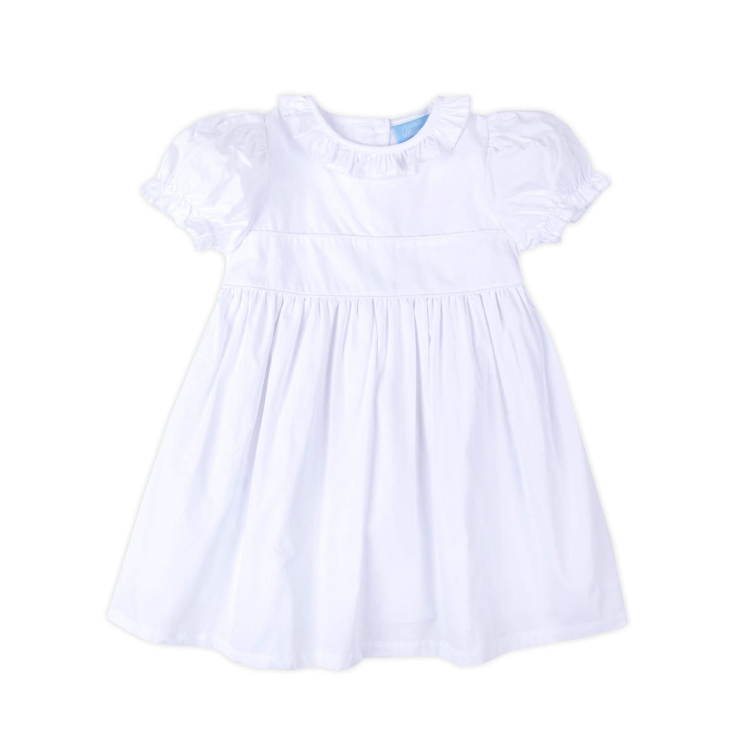Elevate your little one's spring and summer wardrobe with our enchanting Solid White Ruffle Collared Dress. This delightful solid white dress is perfect for special occasions while adding a touch of charm to everyday moments. Made from solid white fabric, it features a ruffle collar and bishop sleeves that create a whimsical and stylish look. Add a monogram for a personalized touch to make this dress truly unique.