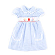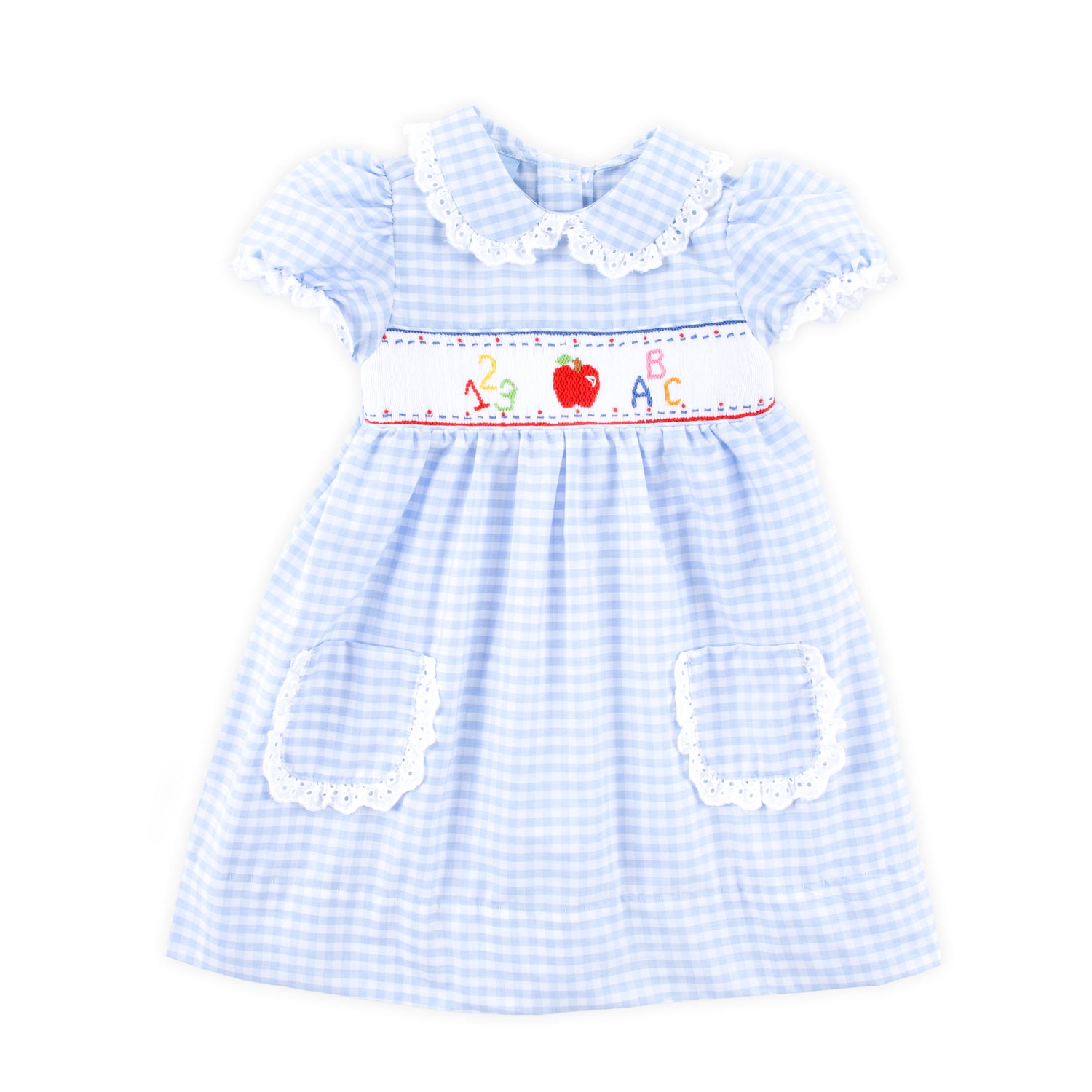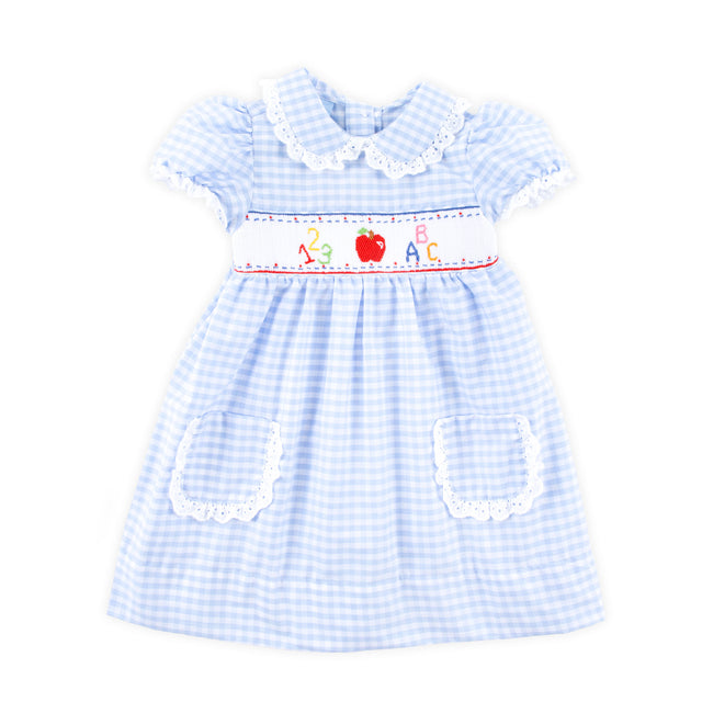 Your little one will enjoy singing her alphabet in our ABC Smocked Light Blue Gingham Cassie Dress. This Cassie-style dress features charming smocked details including an apple, colorful numbers, and letters. Complete with an adorable collar and front pockets, it's perfect for any day of learning and play.
