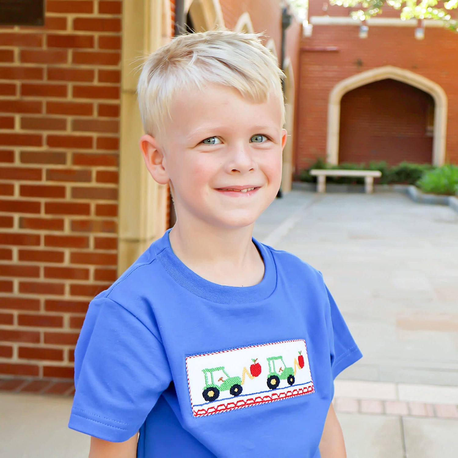 Your little one will be thrilled to start school in our Apple Tractor Smocked Short Set! The blue knit shirt features a delightful hand-smocked tractor with apples, perfectly coordinated with red gingham shorts.