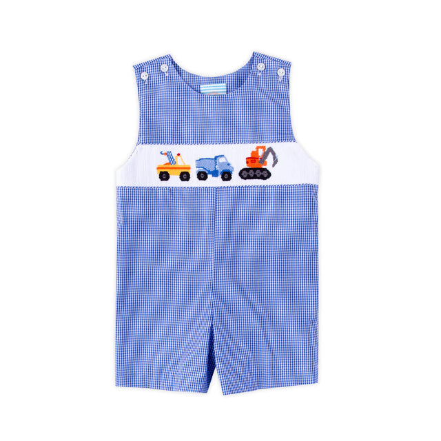 Your little builder will love our Construction Truck Blue Gingham Smocked Jon Jon! This blue gingham Jon Jon features charming smocked construction trucks, making it perfect for everyday adventures. Shoulder buttons and snaps in stride ensure easy changes.