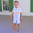 Get ready for fall fun with our Harvest Pumpkin Smocked Light Blue Jon Jon! This stylish and picture-perfect outfit is ideal for any autumn activities and holidays. The Jon Jon in light blue gingham features beautiful smocked pumpkins that will make your little one stand out. Shoulder buttons and snaps in stride for easy changes.