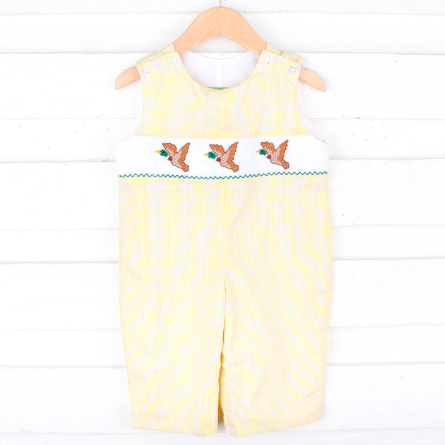 Fall season is here, and your little duckling will look adorable in this Mallard Smocked Yellow Gingham Longall. This charming yellow gingham longall features smocked mallard ducks making it the perfect outfit for duck watching at the park or leisurely park walks. Designed with convenient shoulder buttons and snaps in the stride.