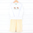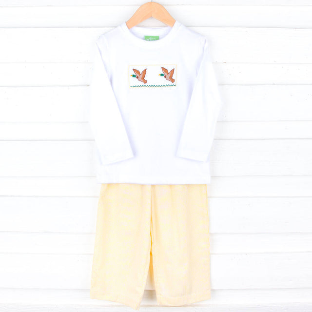Fall season is here, and your little duckling will look adorable in this Mallard Smocked Yellow Gingham Pant Set. The white knit shirt features smocked mallard ducks, while the set is completed with coordinating yellow gingham pants. This is the perfect outfit for duck watching at the park or leisurely park walks.