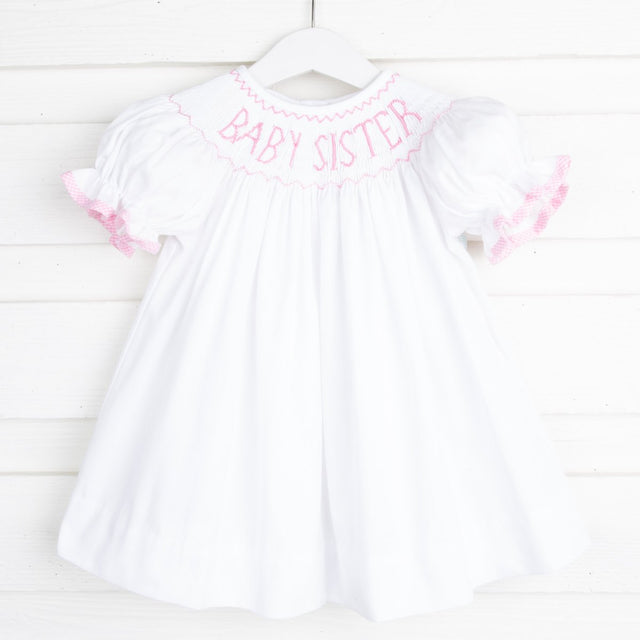 Welcome to the family! This solid white pique dress featuring "Baby Sister" in pink smocked writing and cute bishop sleeves. Wear for baby announcements or newborn pictures.