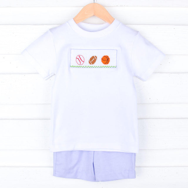 Game on! Get your little sports fan ready to cheer with our Sports Smocked Light Blue Short Set. The white shirt features smocked basketballs, baseballs, footballs, and soccer balls, perfectly coordinated with cool light blue gingham waistband shorts. It's the ultimate outfit for showing off his sporty spirit!