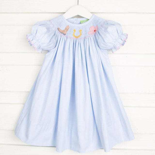 Hey y’all! Your little cowgirl will be the cutest on the frontier in this Western Smocked Bishop Light Blue Gingham Dress! Featuring charming hand-smocked boots, a horseshoe, and a cowgirl hat, this darling dress is perfect for rodeo days, themed parties, or just everyday twirling fun. Saddle up for some sweet western charm!