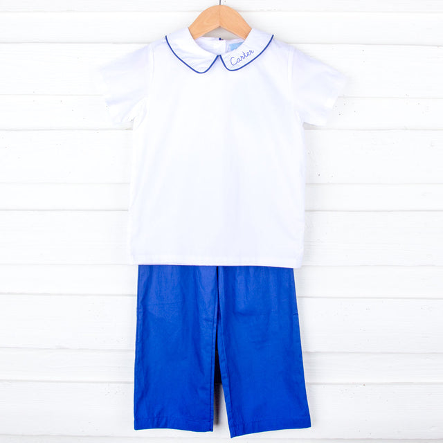 Step into fall with style in our Royal Blue Collared Pant Set! This charming outfit is both elegant and versatile, perfect for everything from family gatherings to a day out. The white short-sleeve shirt features a sweet collar with royal blue piped trim, perfectly coordinated with royal blue pants to complete the look. Plus, you can add a personalized monogram to make it uniquely yours!
