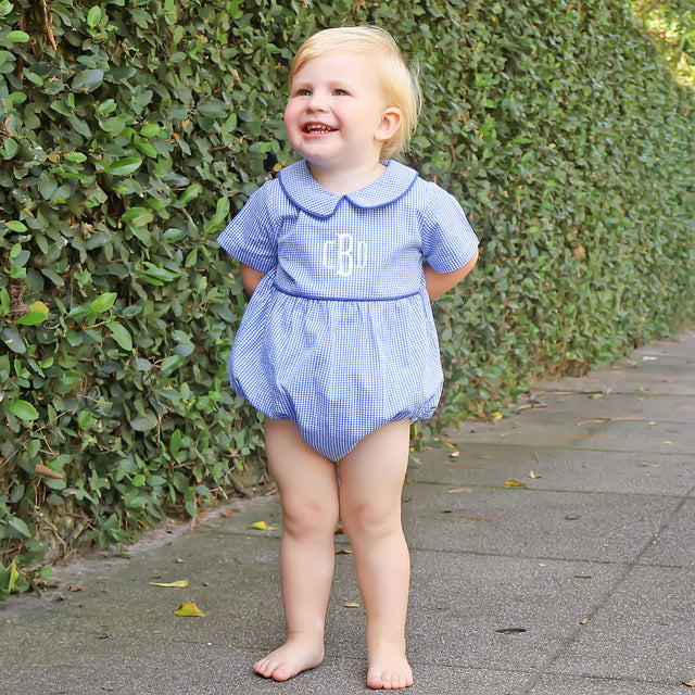 Elevate your little one's wardrobe with our Royal Blue Gingham Collared Bubble. The perfect addition for the season, this bubble is both stylish and versatile. It features short sleeves, a collar, and snaps in stride for easy changes. Ideal for outings to the pumpkin patch, Thanksgiving gatherings, Easter, Patriotic events or any special occasion, this outfit is sure to make your little one stand out. Personalize it with a monogram to make it even more special and unique!