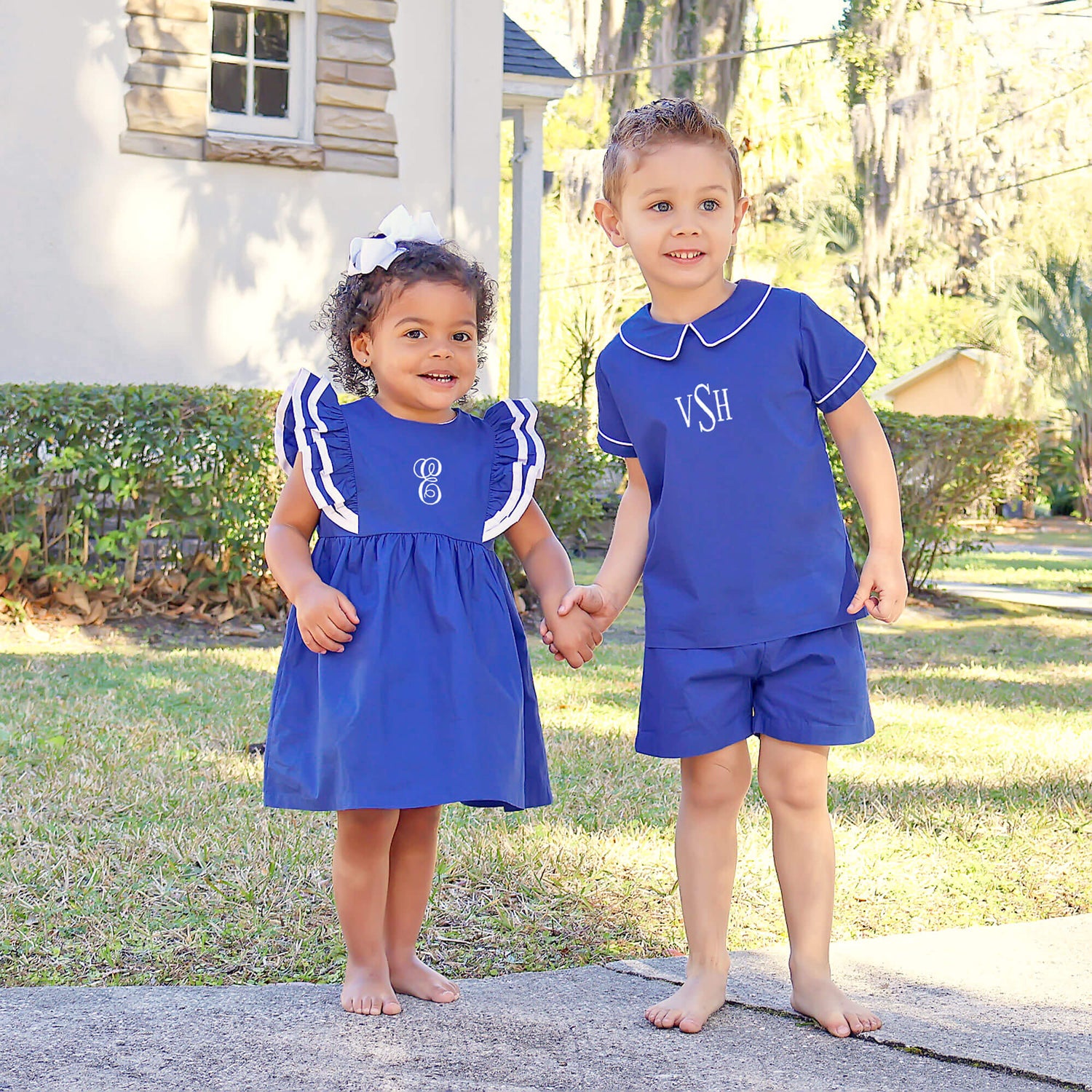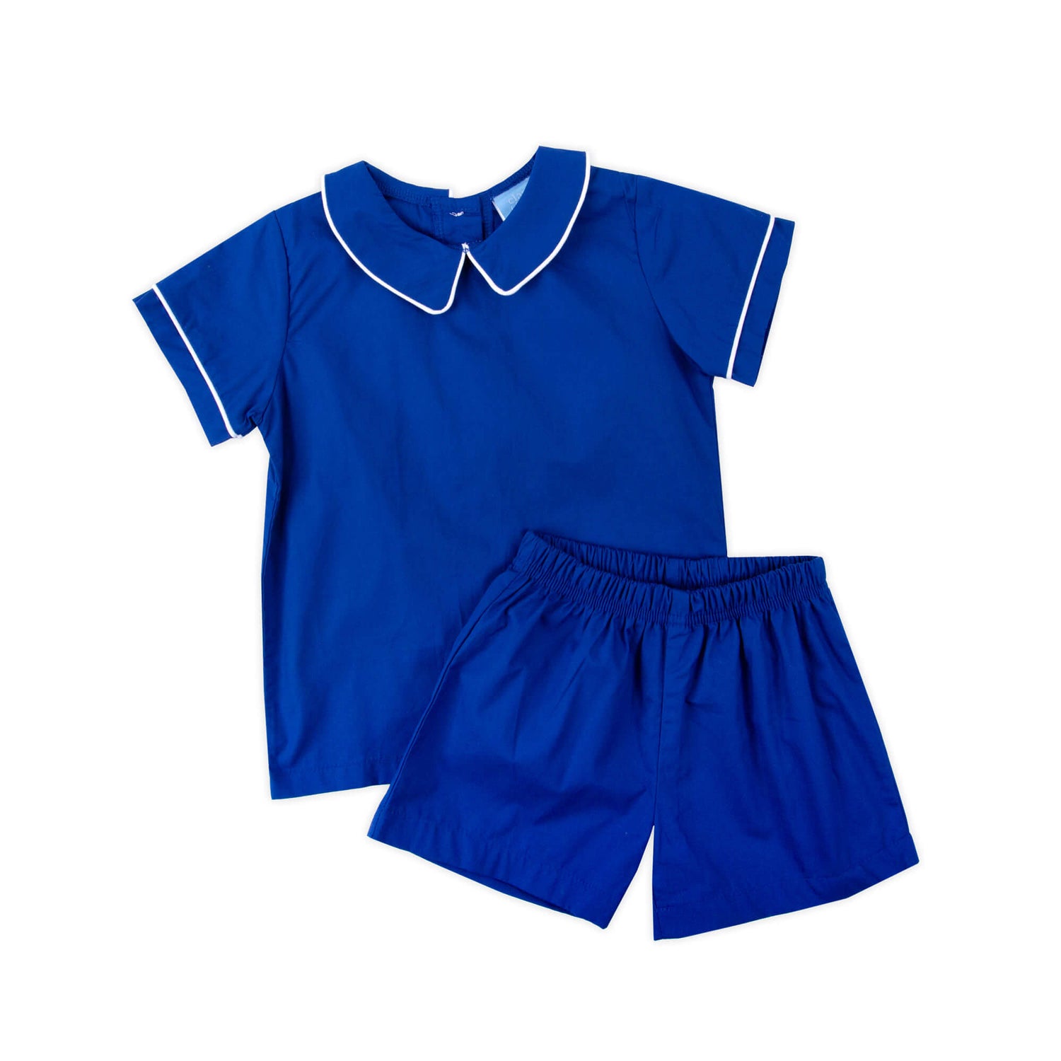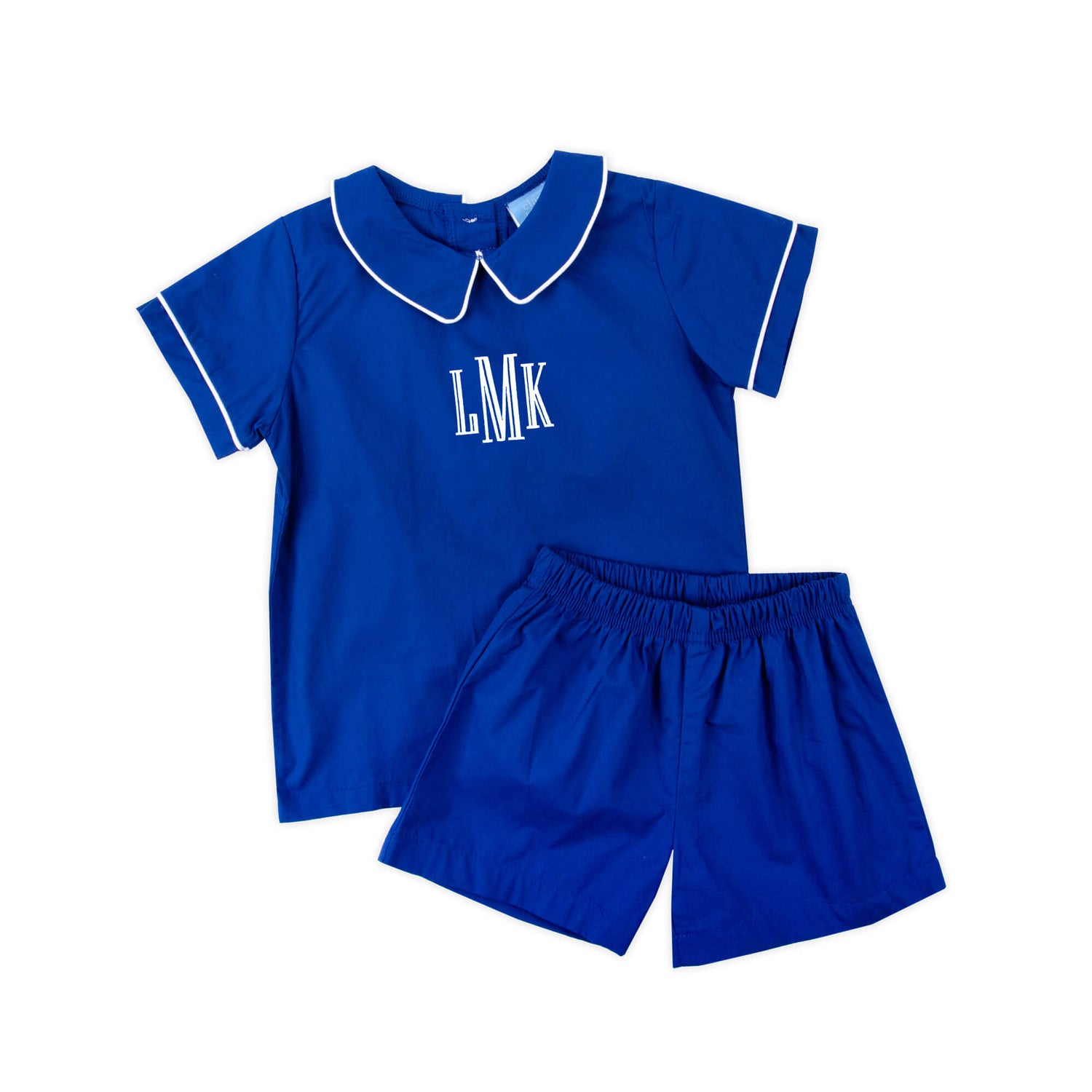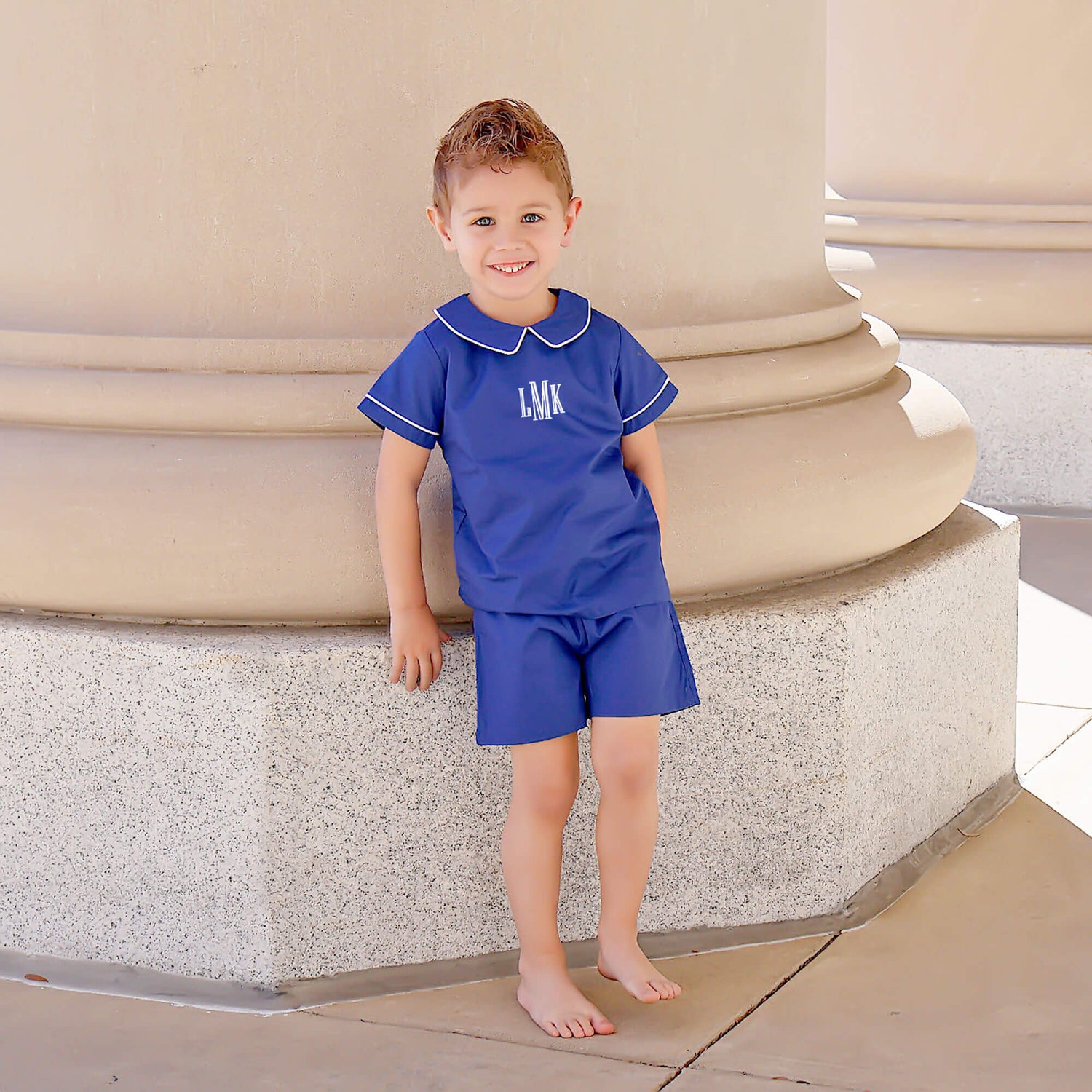 Introducing our timeless Royal Blue Collared Short Set, a versatile and classic outfit perfect for any occasion or holiday celebration. The royal blue short sleeve shirt features an elegant collar with white piping, creating a simple yet polished look that’s a must have in every little one’s wardrobe. Paired with solid royal blue shorts, it effortlessly combines style and comfort. Add a monogram for a personalized touch to make this outfit uniquely theirs.