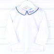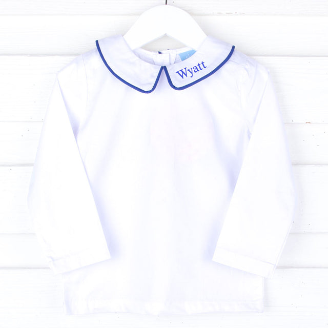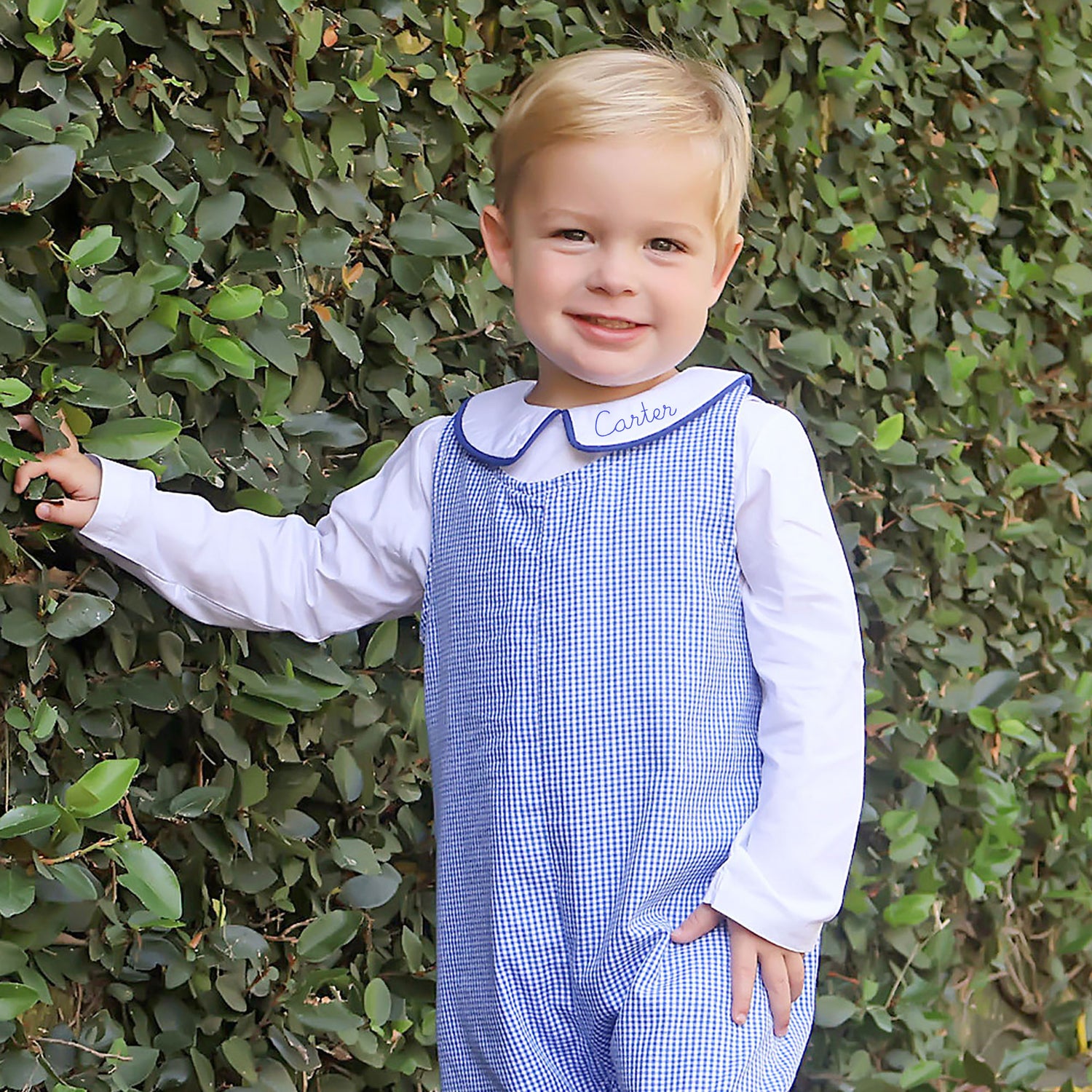 Add this White Undershirt with Color Trim to your little one's fall and winter wardrobe. This long sleeve white shirt features a collar with piping available in a variety of colors including tan gingham, red, green, light blue and royal blue.