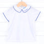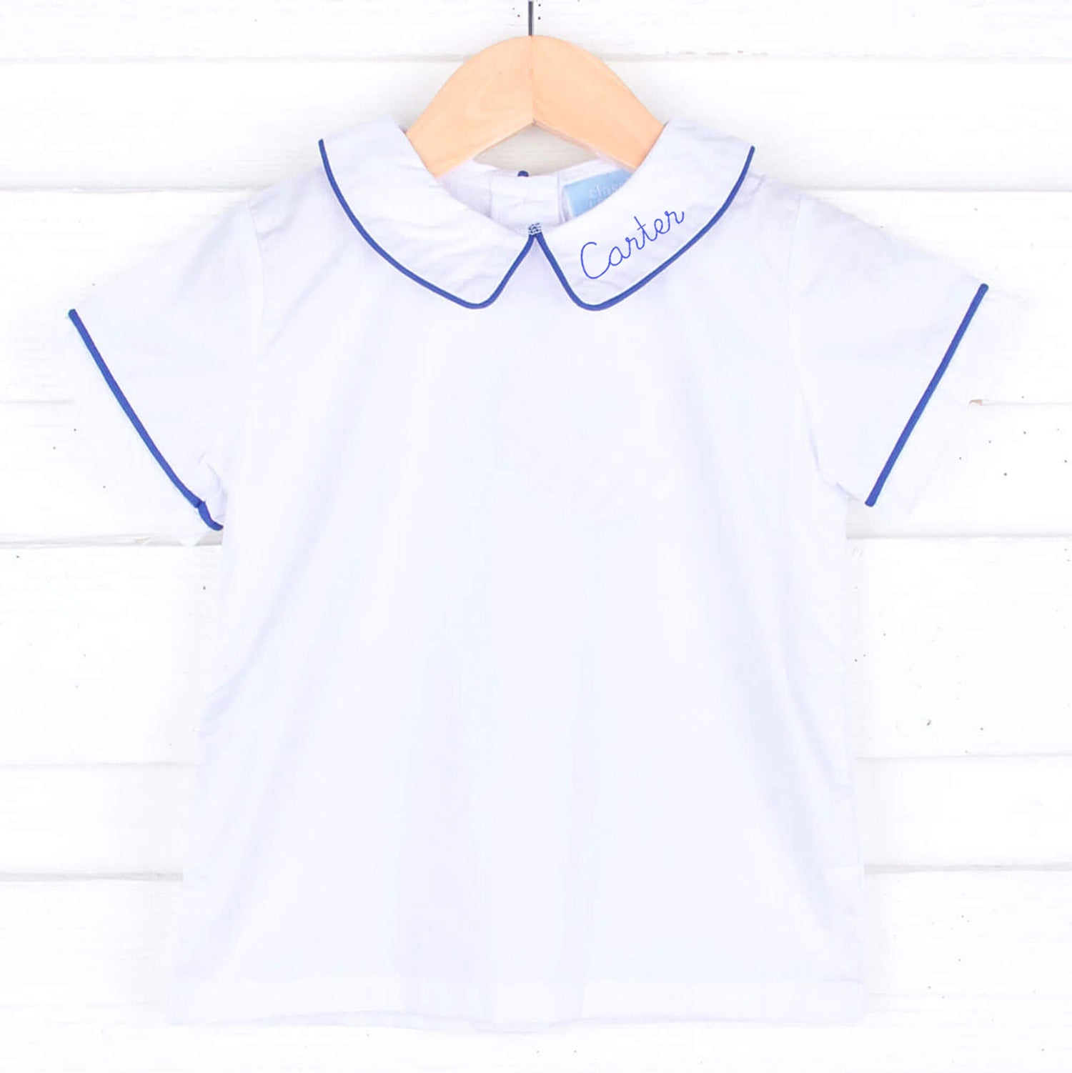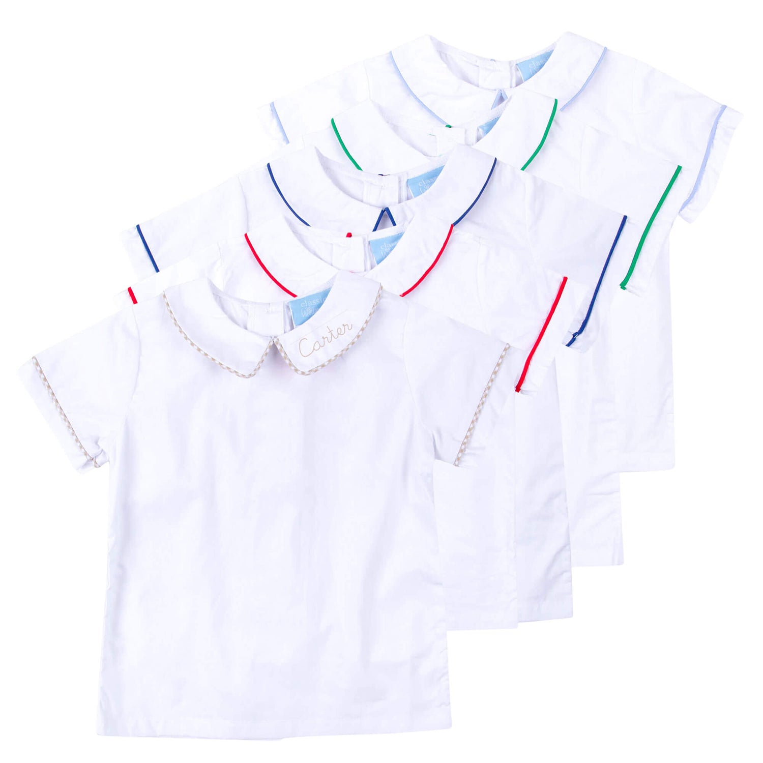 Add this White Short Sleeve Undershirt With Color Trim to your little one's spring and summer wardrobe. This short sleeve white shirt features a collar with piping available in a variety of colors including tan gingham, red, green, light blue and royal blue.