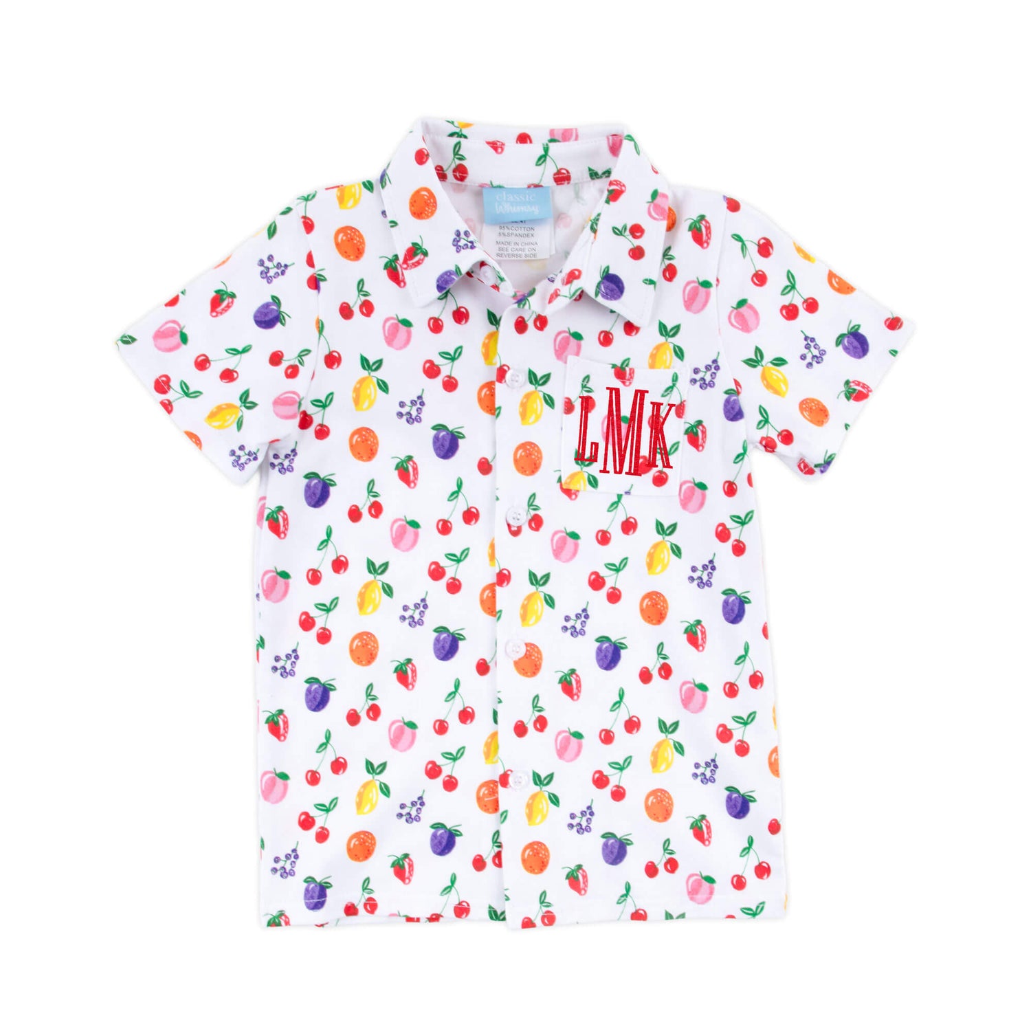 Get ready to celebrate the vibrant spirit of summer with our delightful Fruity Print Short Sleeve Button Down. The knit polo features a playful fruit print. Add a monogram for a personalized touch, and adding charm to his sunny day.
