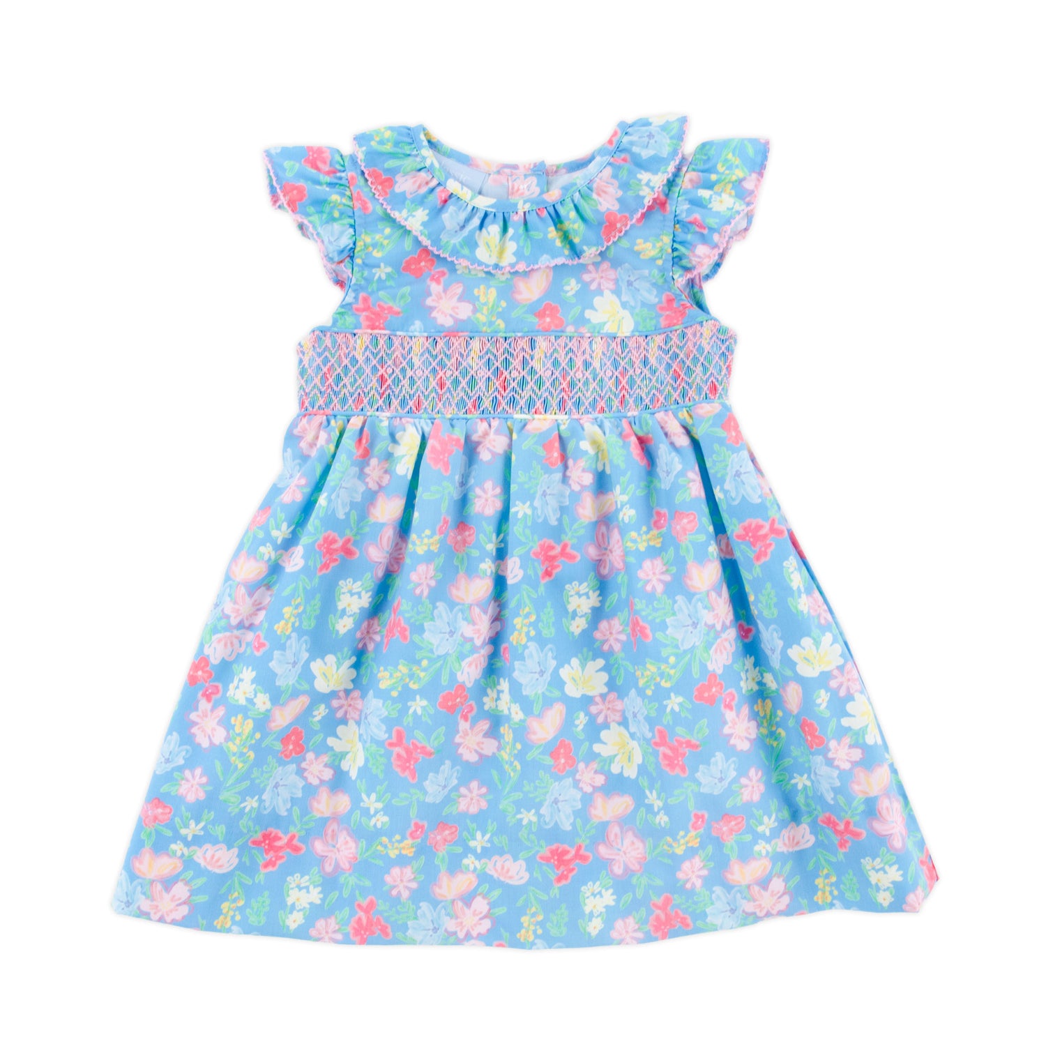 Celebrate the beauty of spring in our Evergrace Floral Blue Smocked Ruffle Collared Dress. Featuring a soft blue backdrop with a delicate pink floral print, this darling style is finished with a sweet ruffle collar, flutter sleeves, and classic geometric smocking. Perfect for Easter, family gatherings, and sunny spring celebrations.