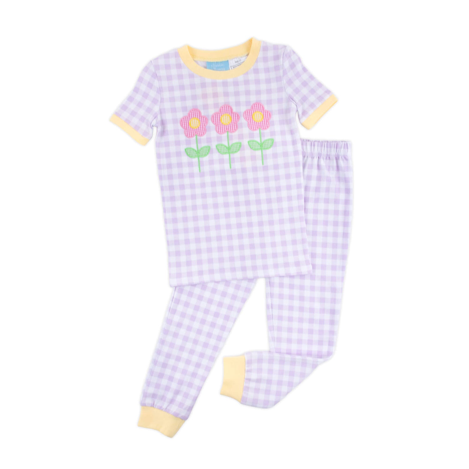 These Flower Trio Lavender Gingham Pajamas are perfect for spring and summer nights. The purple gingham short sleeve pajama top features three sweet flower appliqués and is paired with matching pull on pajama pants for a comfortable and adorable bedtime look. Add a monogram for an extra special personalized touch.