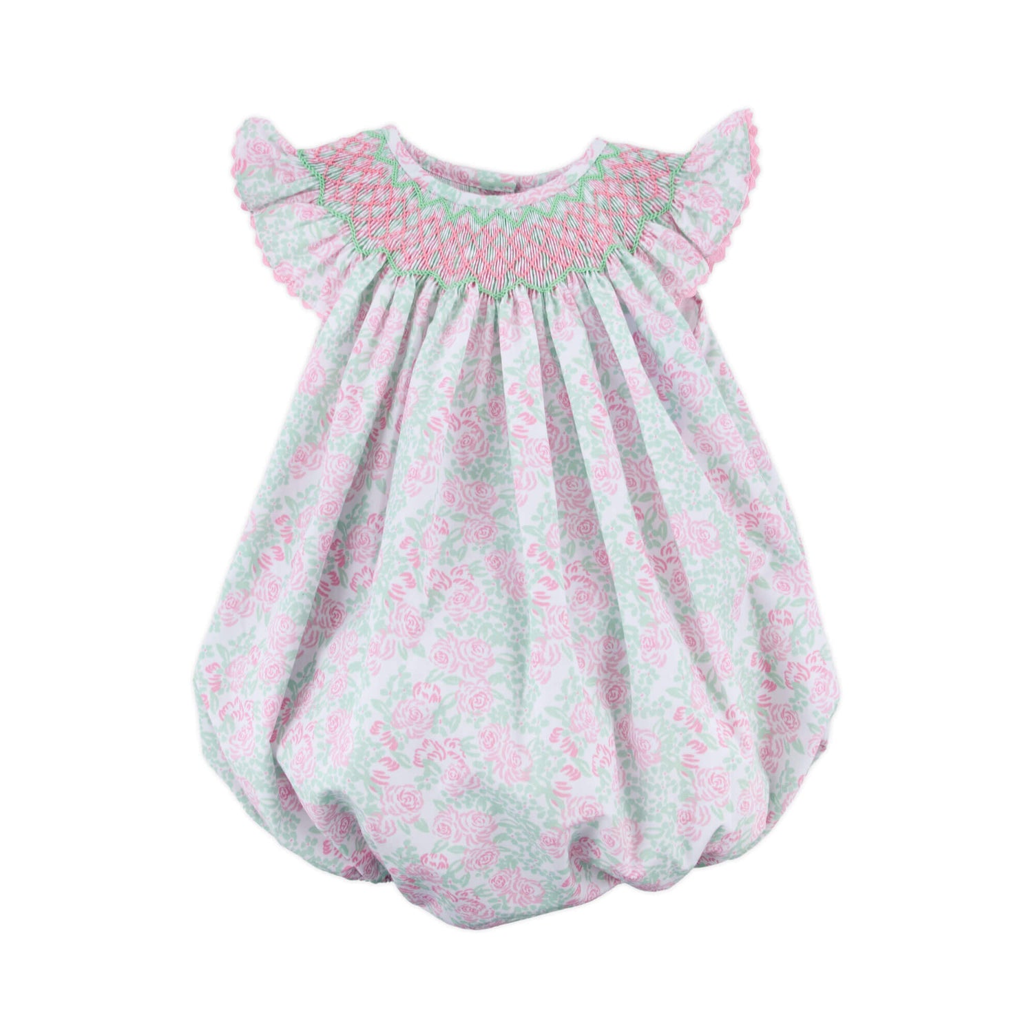 Welcome spring in our Gardenia Floral Smocked Angel Sleeve Bubble. Featuring a lovely pink and green floral print, sweet angel sleeves, and intricate geometric smocking, this timeless bubble is perfect for sunny days and special occasions. Snaps in stride for easy changes