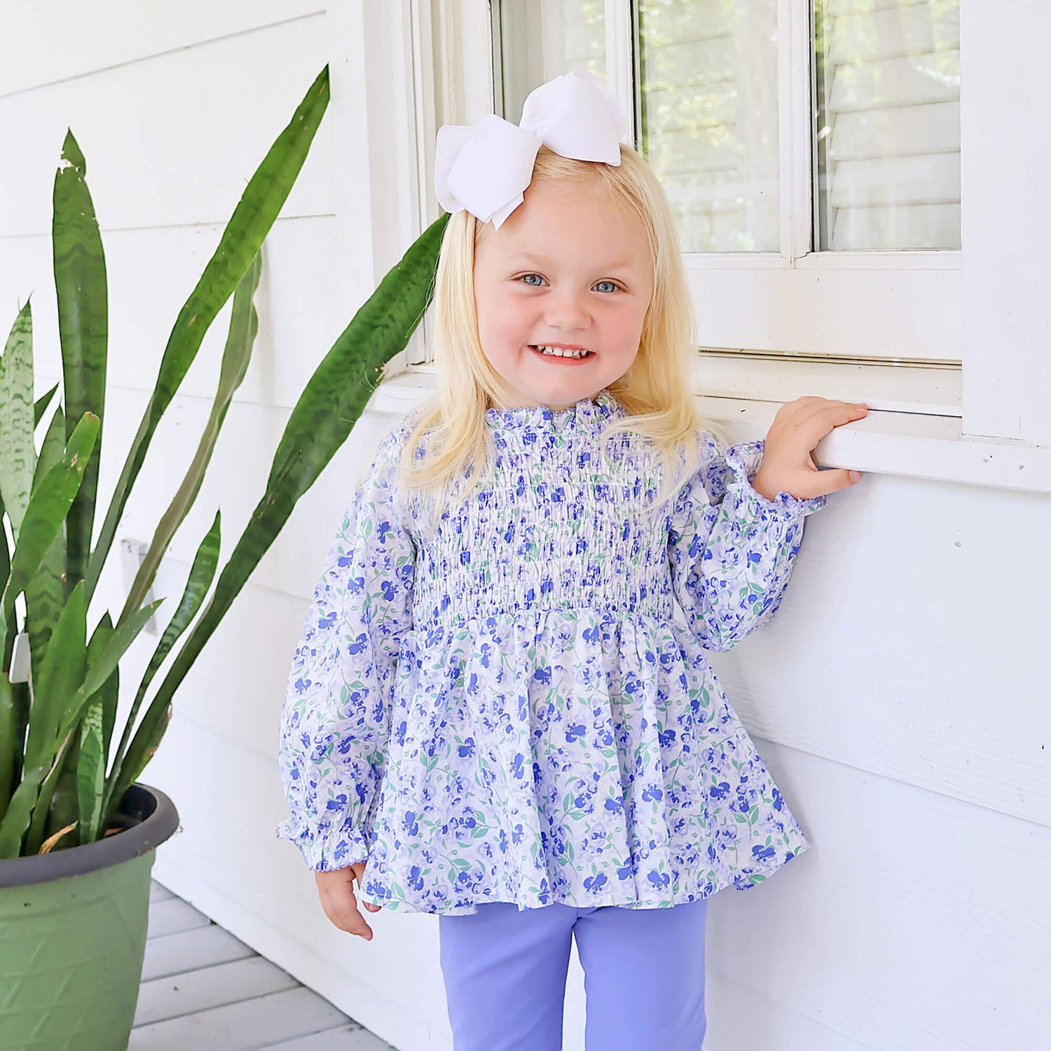 This Duke Garden Blue Ariella Legging Set is the perfect outfit for transitioning into fall. The Ariella-style top features a beautiful blue floral print, a stretchable smocked bodice, and long bishop sleeves for a touch of elegance. The set is coordinated with blue leggings.
