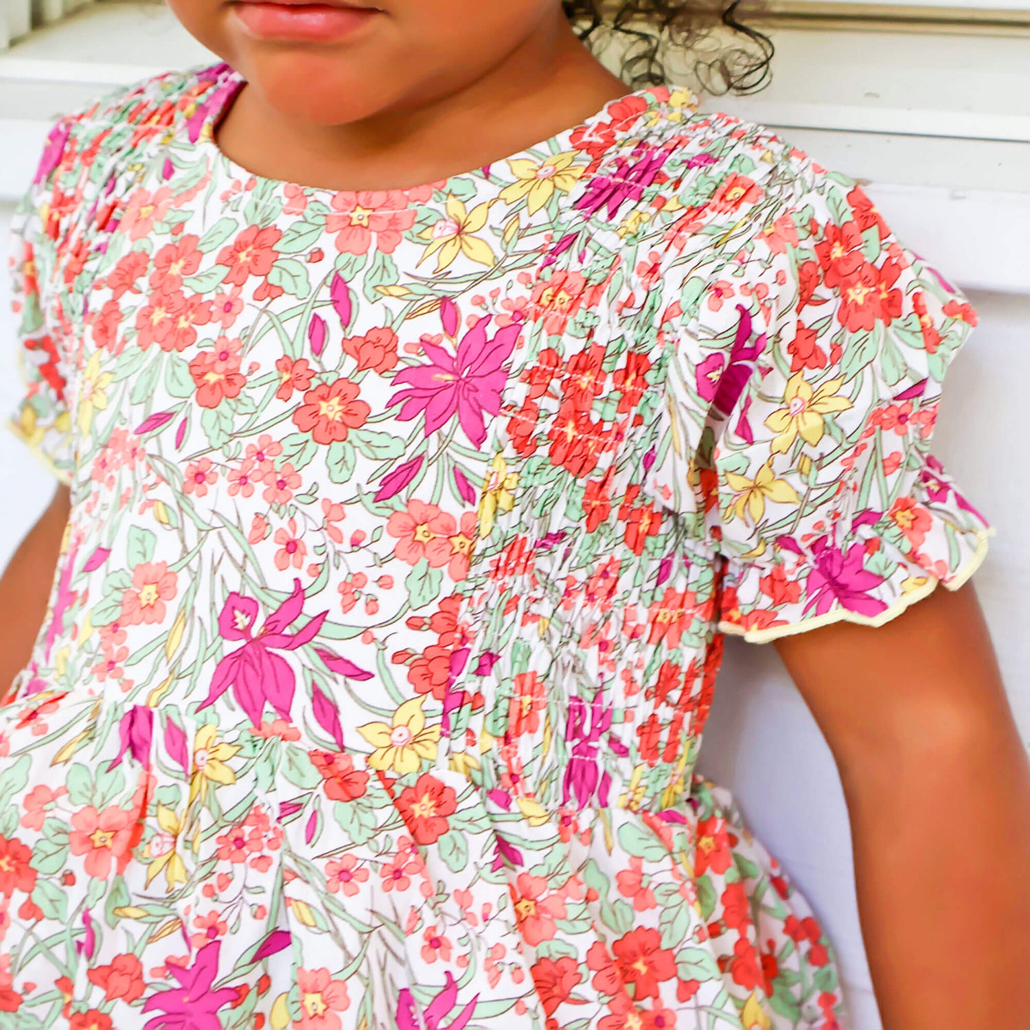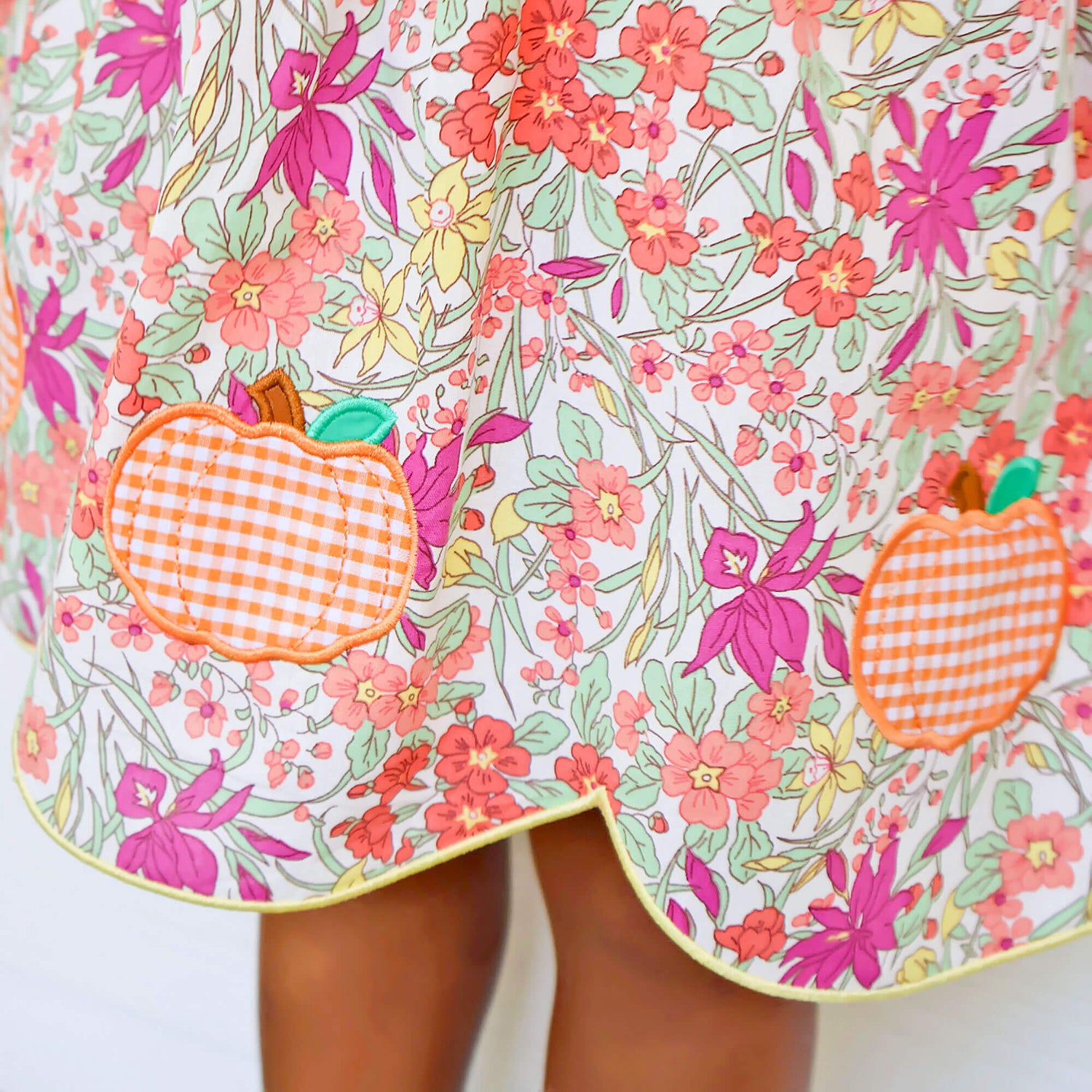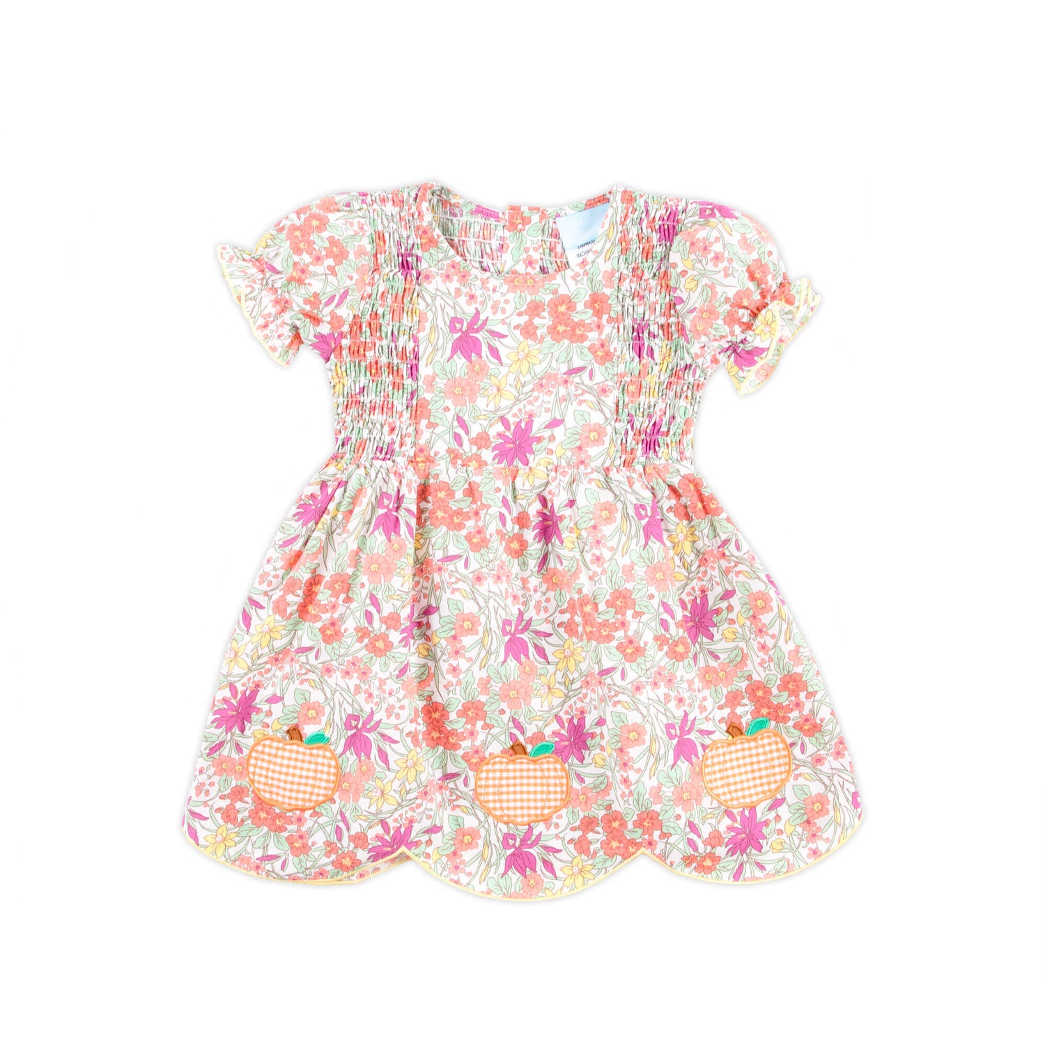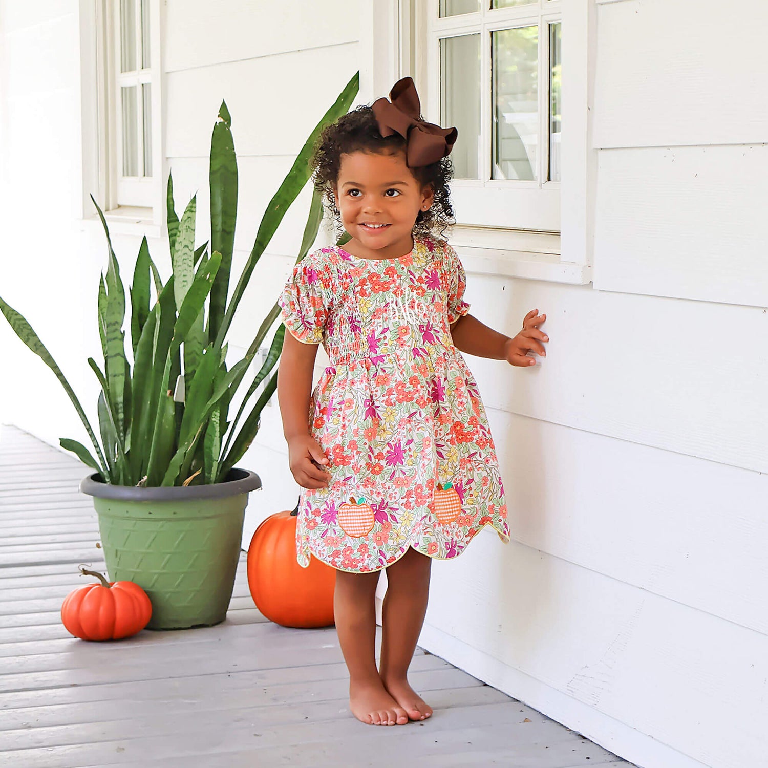It’s pumpkin season, and your little one will be the cutest at the pumpkin patch in this adorable Pumpkin Pink Floral Smocked Aria Dress! This Aria-style dress features a pink and orange floral design with pumpkin appliqués along the scalloped hem. Elegant smocking details and bishop-style sleeves make it a perfect pick for fall festivities!
