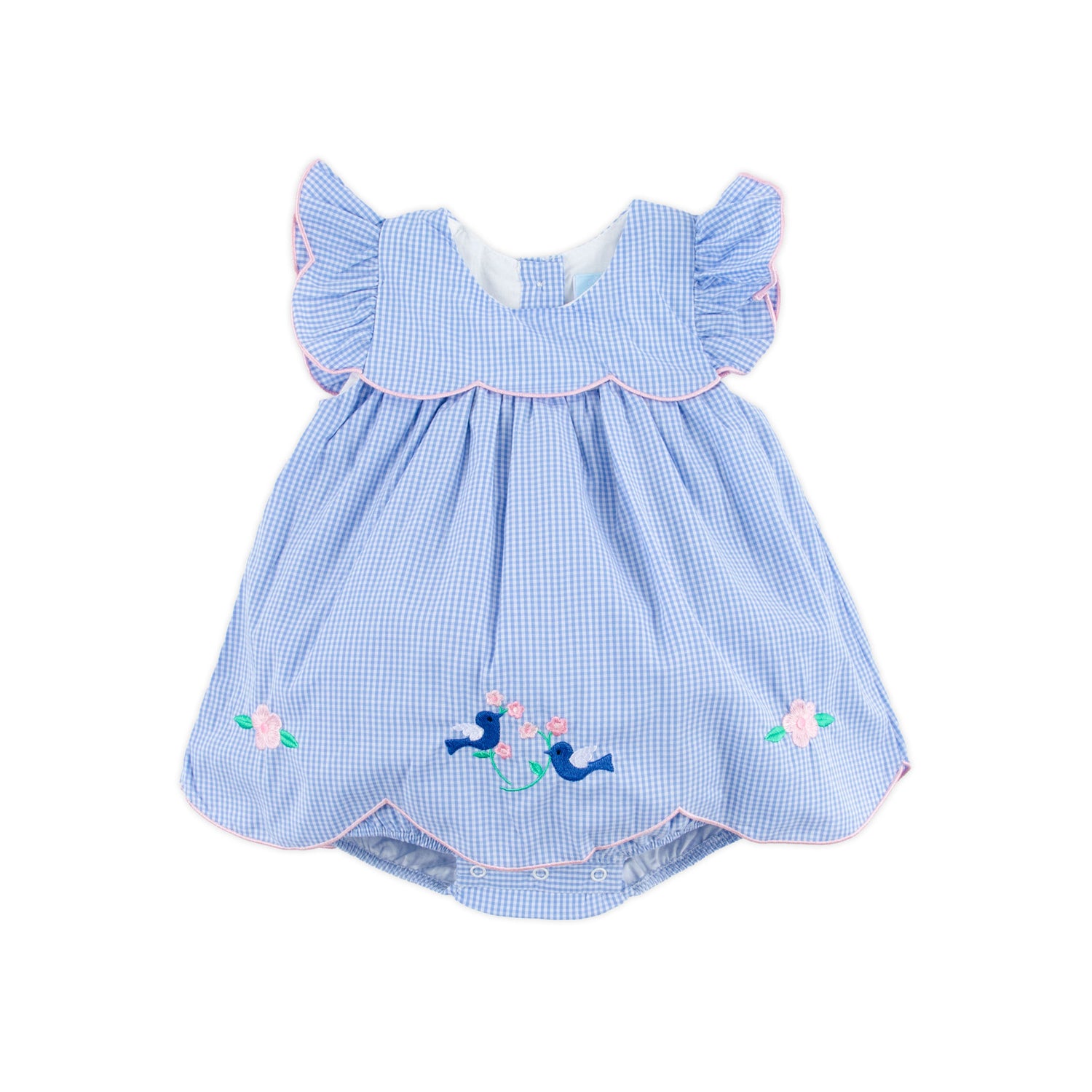 Celebrate springtime in our Sweet Bird Embroidered Light Blue Gingham Amelia Skirt Bubble! This darling skirt bubble features delicate bird embroidery and an adorable scalloped hem. With snaps in stride for easy changing. Add a monogram for a personalized touch that makes it extra special.