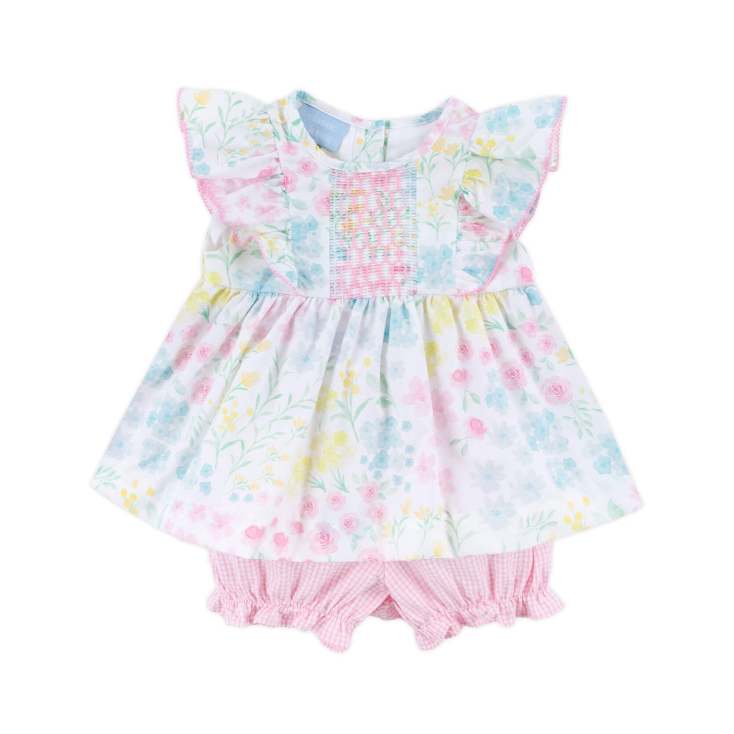 The Sweet Floral Smocked Rachel Bloomer Set is a timeless favorite for church, celebrations, and warm-weather gatherings. Designed with a soft pastel floral print, delicate geometric smocking, and flutter ruffle sleeves, it’s perfectly paired with pink gingham bloomers for a look that blends heirloom charm with everyday sweetness.