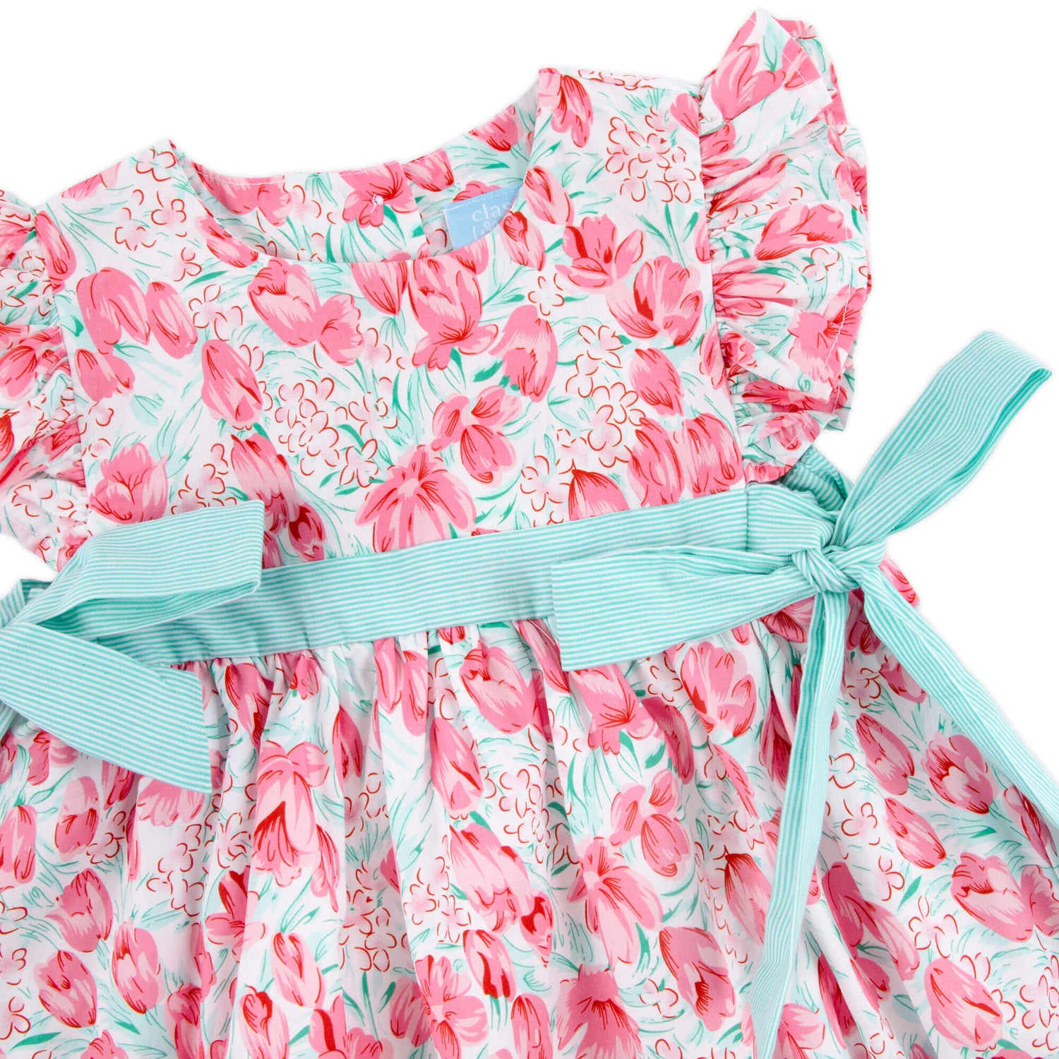 This Sweet Tulips Pink Avery Dress is a lovely choice for spring days. Designed in a charming pink tulip print, this Avery style dress features soft flutter sleeves finished with pink trim and sweet side tie bows for an extra special touch. Add a monogram to personalize the look and make it even more darling.