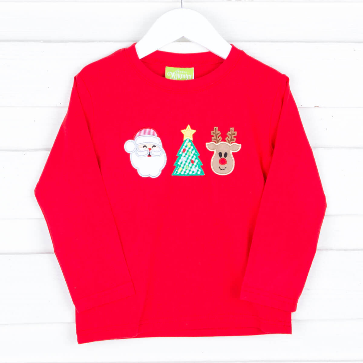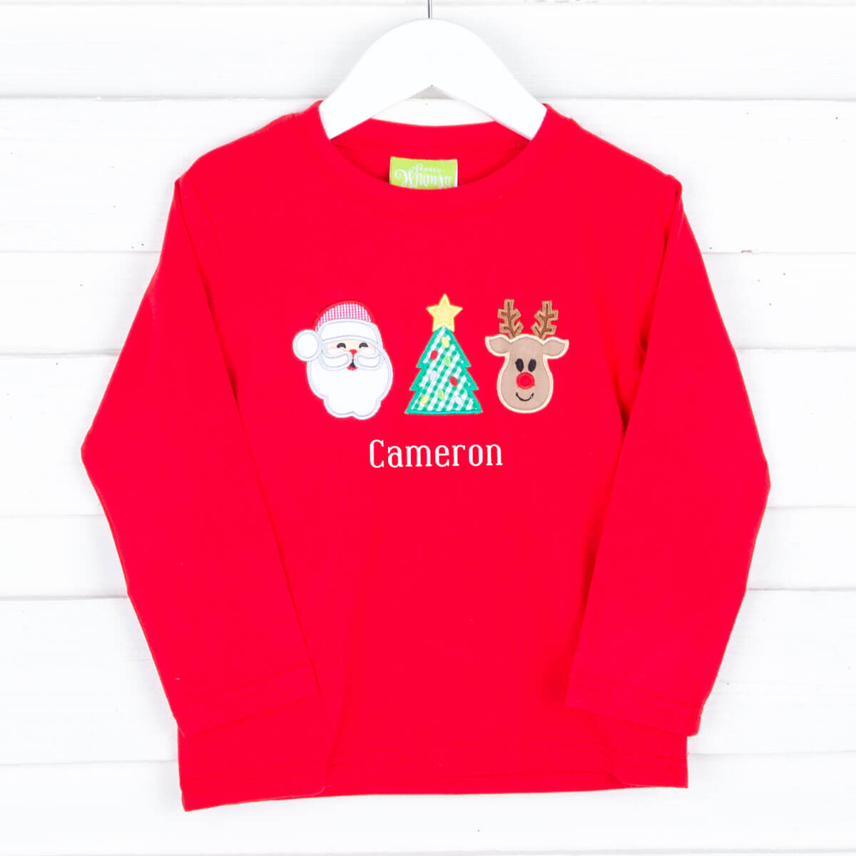 This fun shirt design perfectly captures the magic of Christmas! Features a Santa, Christmas Tree, and a reindeer applique. Don't forget to add a monogram name!