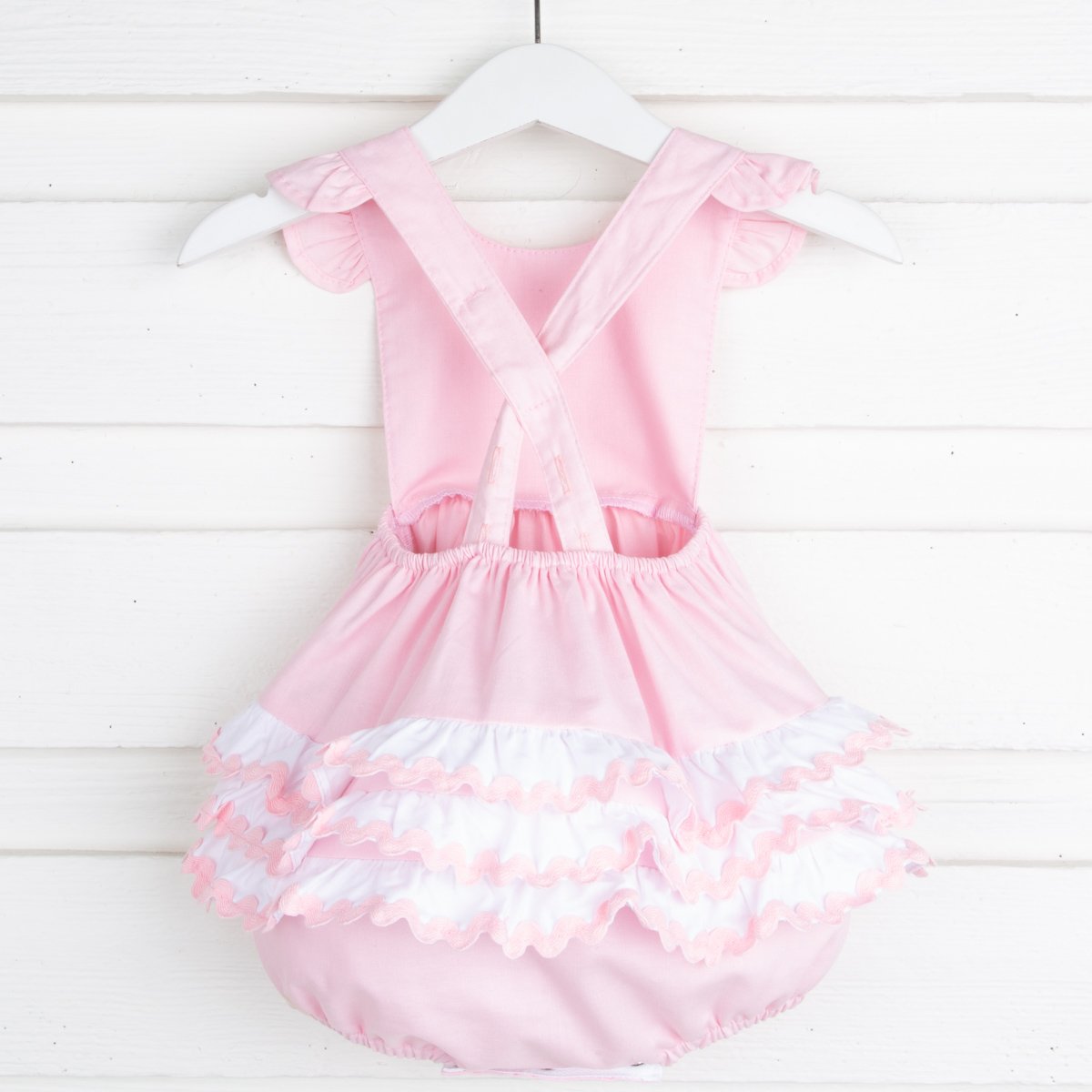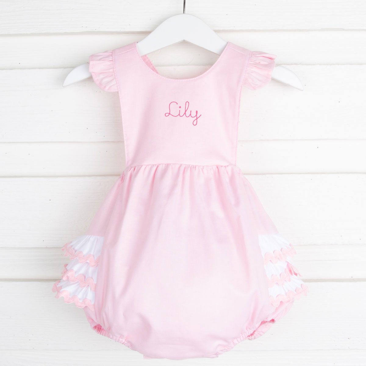 Monogram this solid pink ruffle bubble for the cutest look! Features sweet white ruffles with pink ric rac for an adorable look. Snaps in the stride.