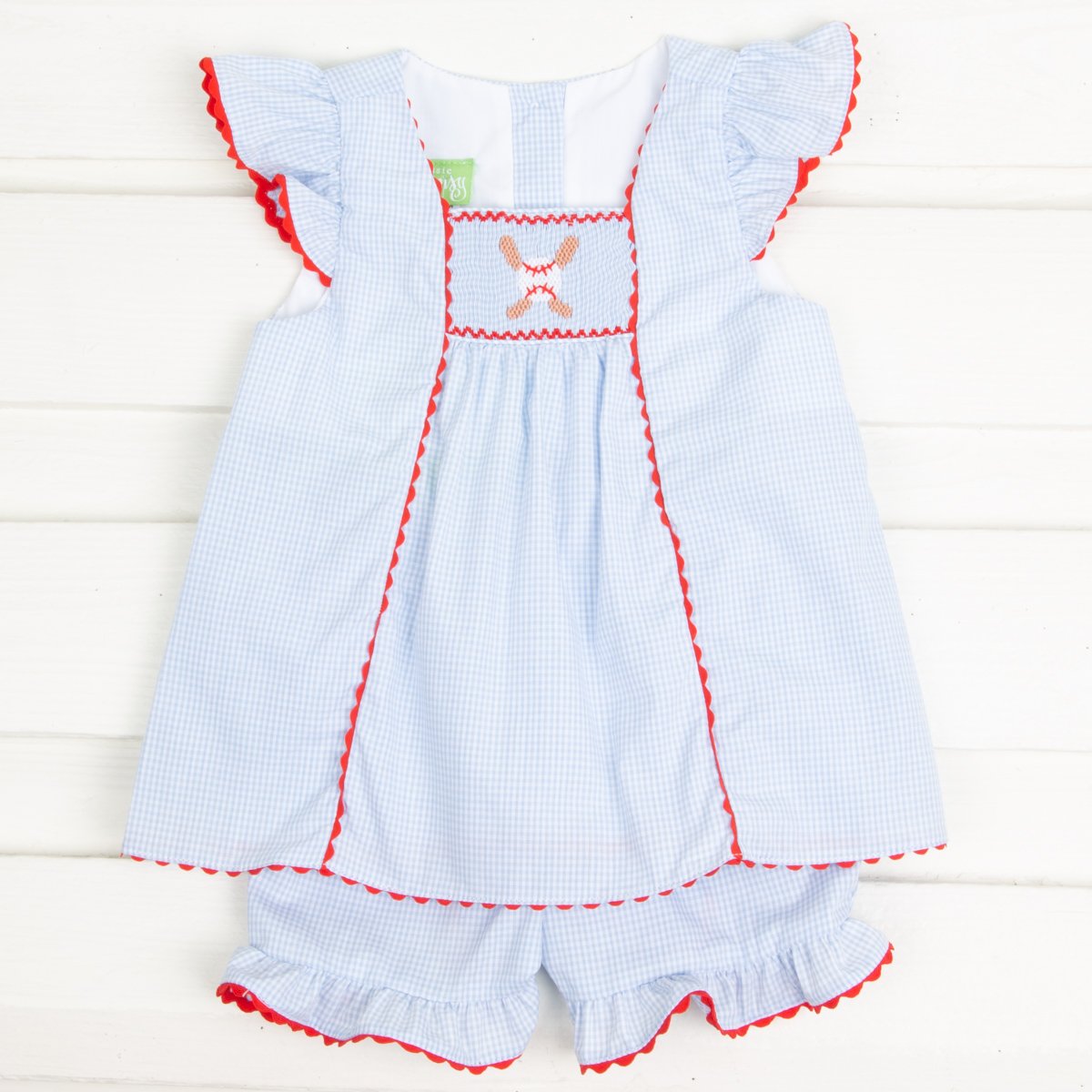 This short set is ready for a day at the park! We love the light blue gingham and with red ric rac details. The single smocked baseball ties the look together!
