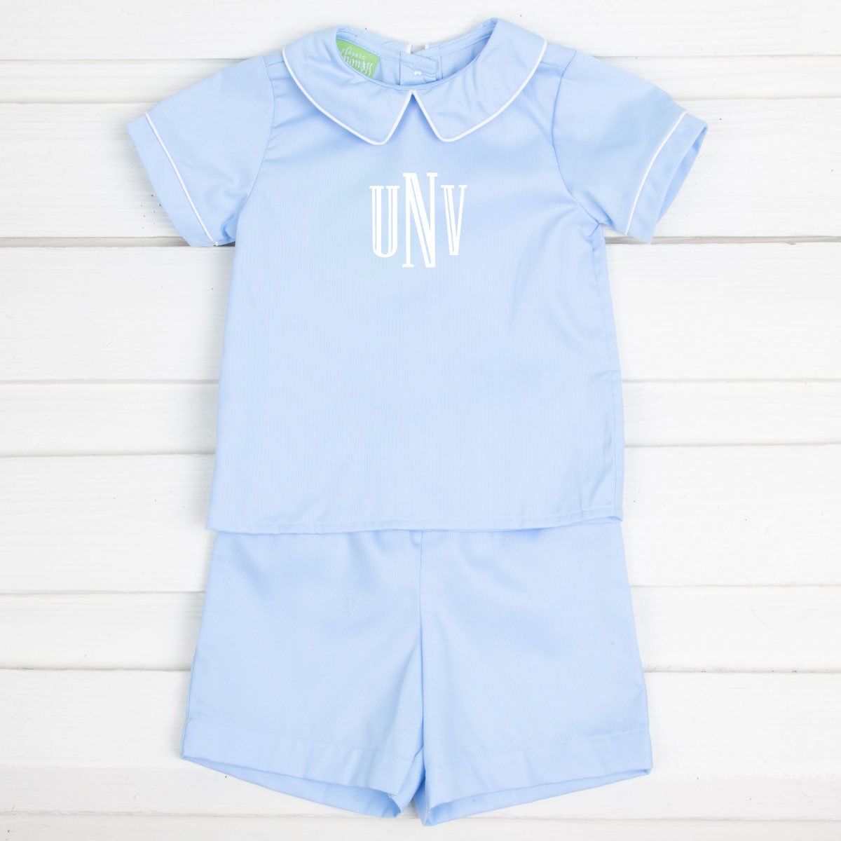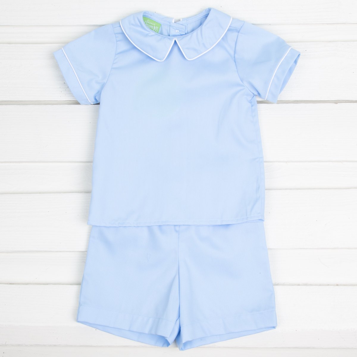Peter pan collared short sleeve shirt with matching elastic waist shorts. White piping along collar and sleeves. A staple in every little boy's wardrobe.
