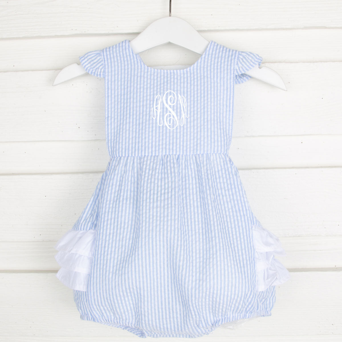 Adorable blue stripe seersucker ruffle bubble! Features solid white ruffles. Snaps in stride.