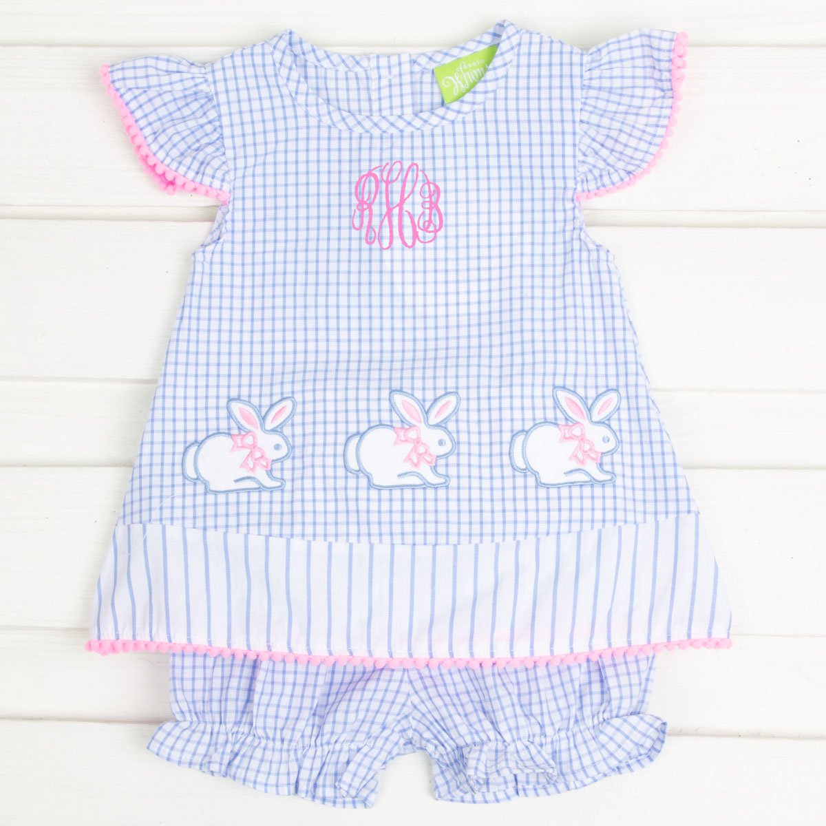 Adorable blue windowpane bloomer set! Features three bunnies and neon pink mini pom pom trim. Perfect for Easter!