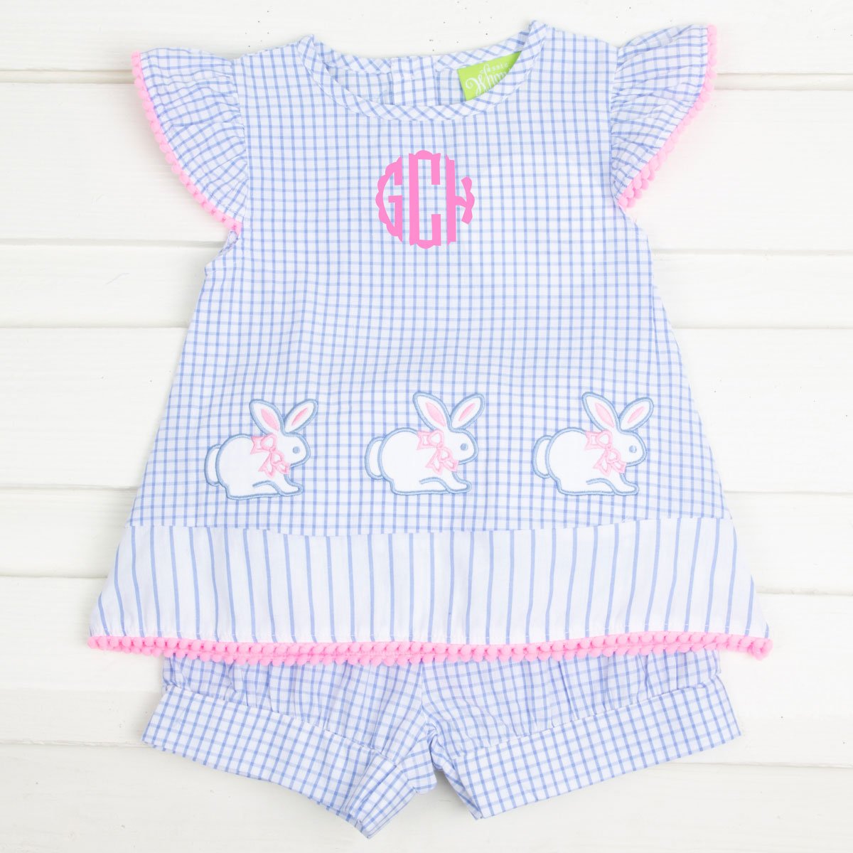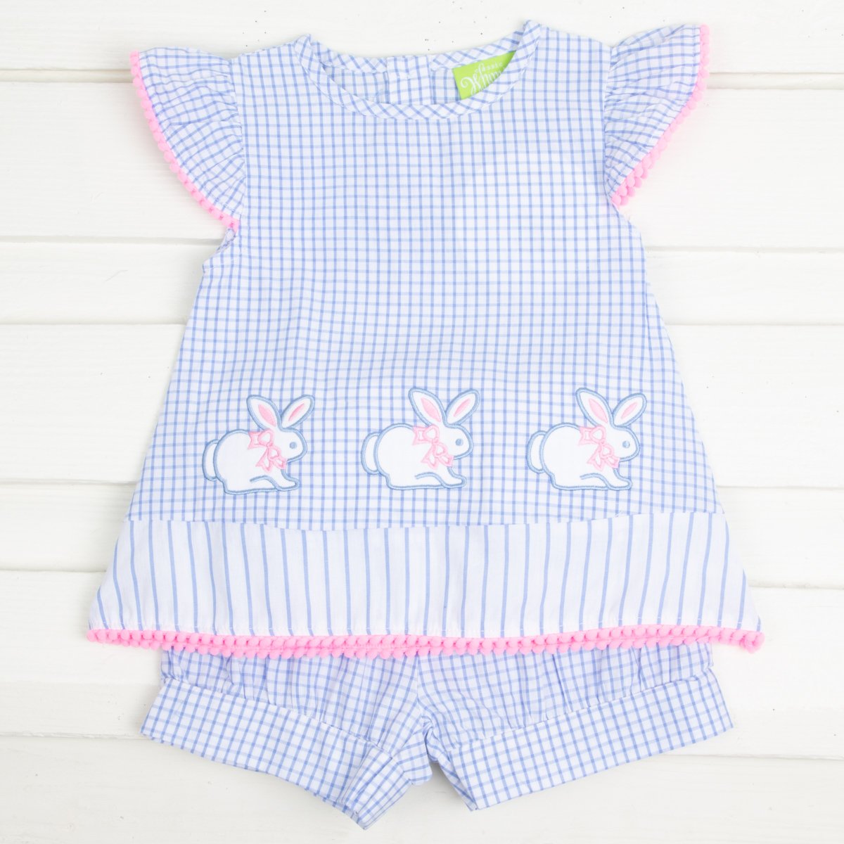 Precious blue windowpane short set for your little girl! Features three bunnies and neon pink mini pom pom trim. Perfect for Easter!
