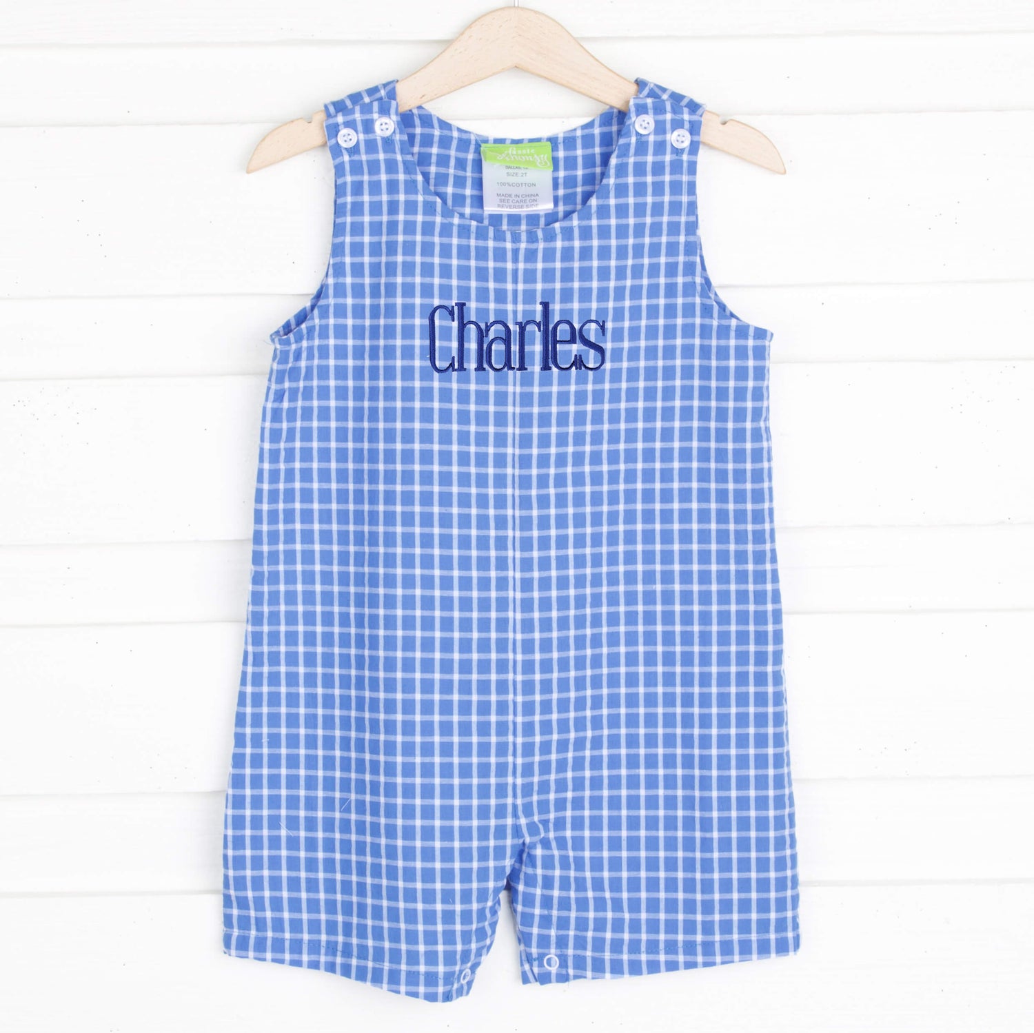 The perfect jon jon for the season! Features blue windowpane fabric. Perfect for a monogram. Snaps in stride.