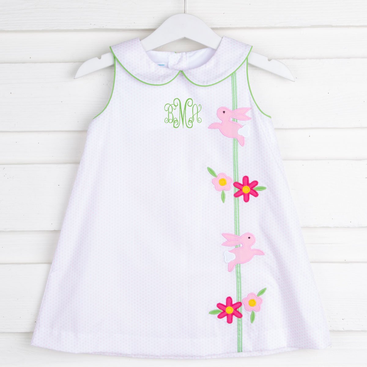 Bunnies and Flowers Applique Sally Dress Pink Dot