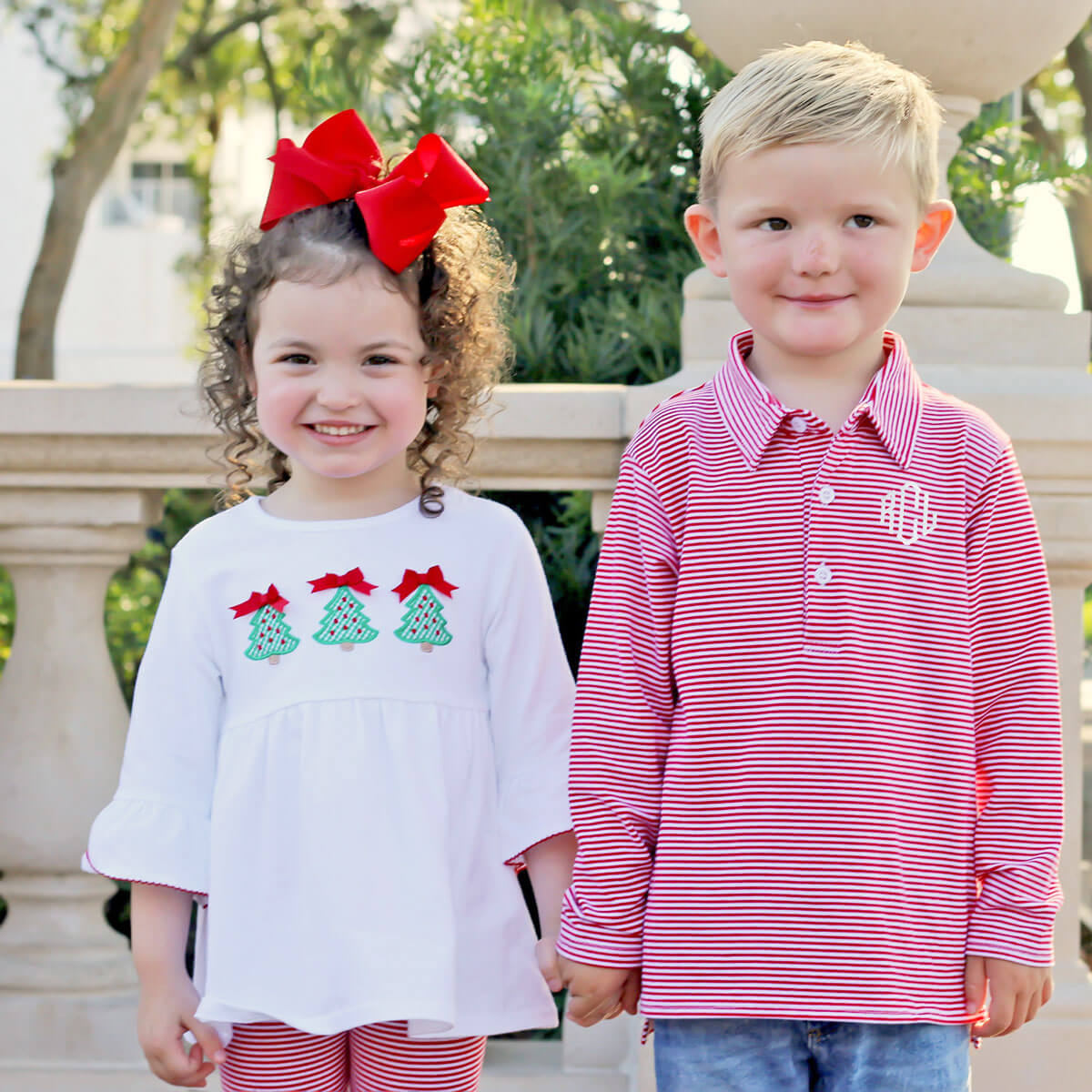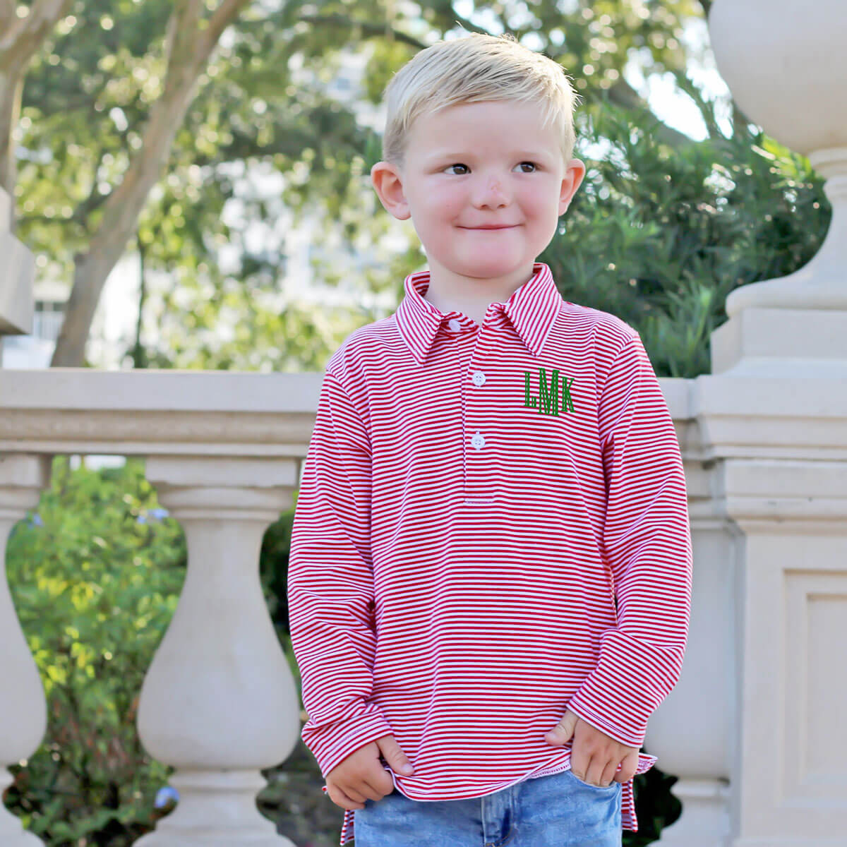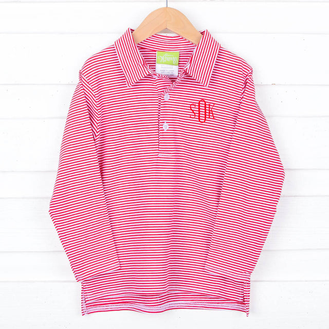 This Red Stripe Long Sleeve Polo is made from super soft knit fabric. Mix and match it with your favorite bottoms for a versatile look. Perfect for school days, holiday parties, playtime fun, comfort, and cuteness! Don’t forget to add a monogram for a personalized touch!