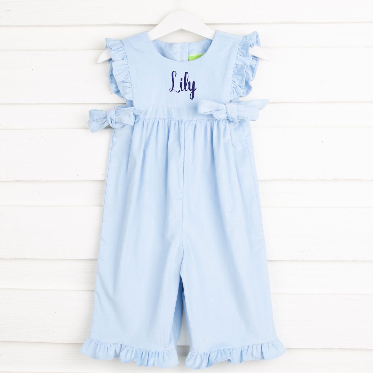 Our favorite Savannah style looks perfect in this light blue corduroy! Perfect for the cooler days and nights. Personalize with a monogram to make this romper so special! Zipper in the stride.