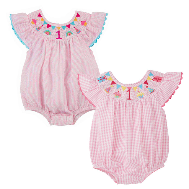 Celebrate your little one with our First Birthday Pink Smocked Bubble. Features seersucker gingham fabric, flutter sleeves, birthday hand-smocked, and snaps in stride.
