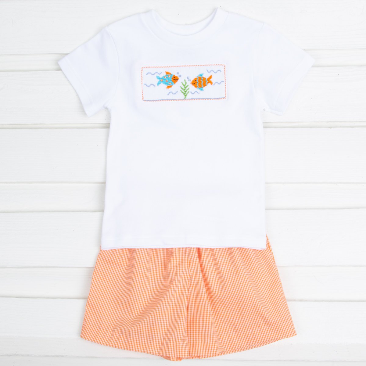 An easy and cheerful Summer set! This white knit shirt features hand smocked fish details and pairs with orange gingham shorts.