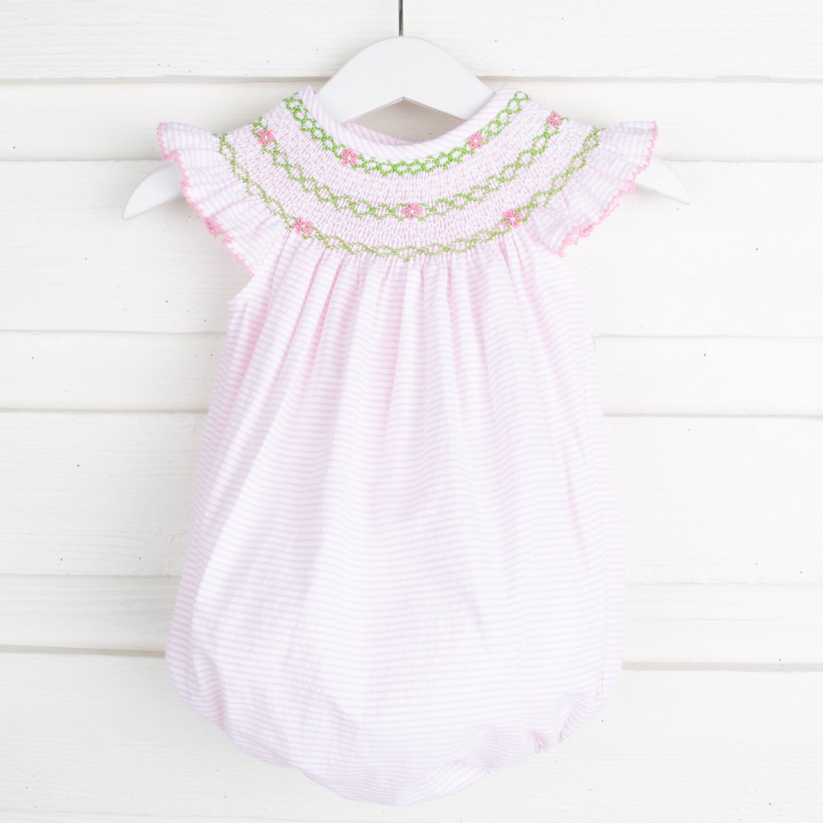Geometric Floral Smocked Bubble Pink Stripe Seersucker