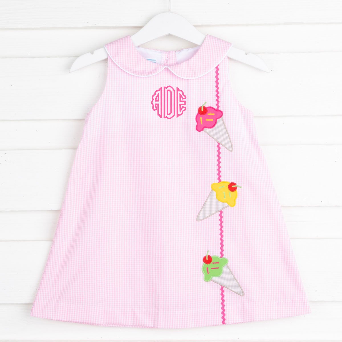 Three applique ice cream cones on a light pink gingham fabric. Sleeveless girls' dress. Peter pan collar. White piping along collar.