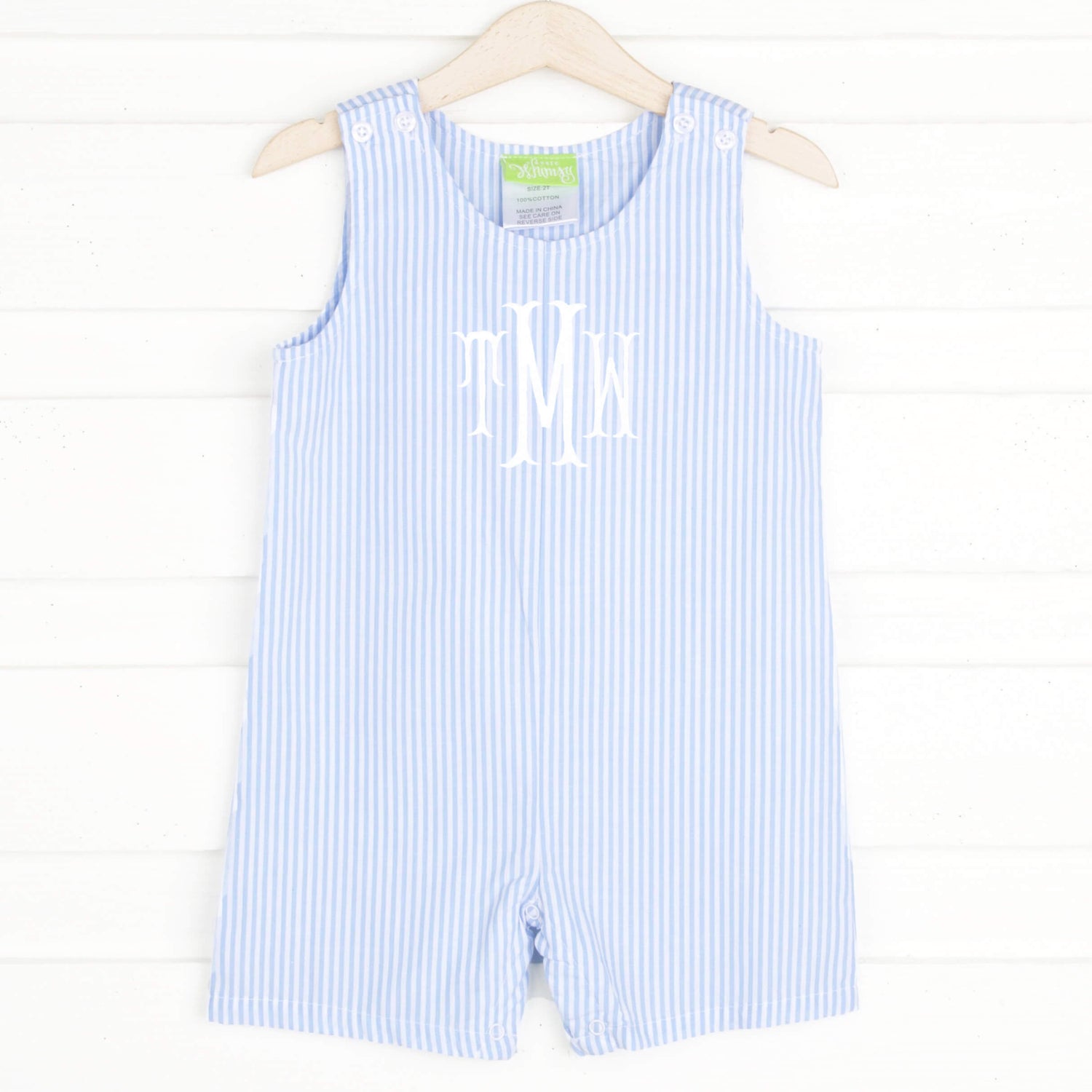 The perfect light blue stripe jon jon for the season! Add a monogram. Snaps in stride.