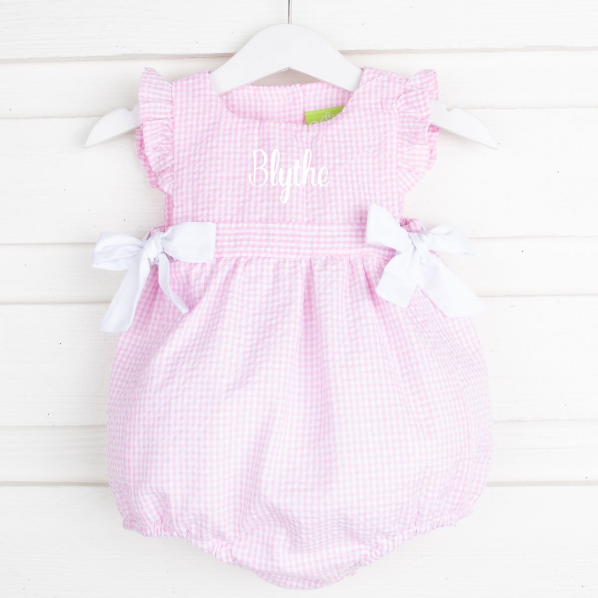 The cutest light pink gingham side tie bubble! Snaps in stride. Perfect all season long!