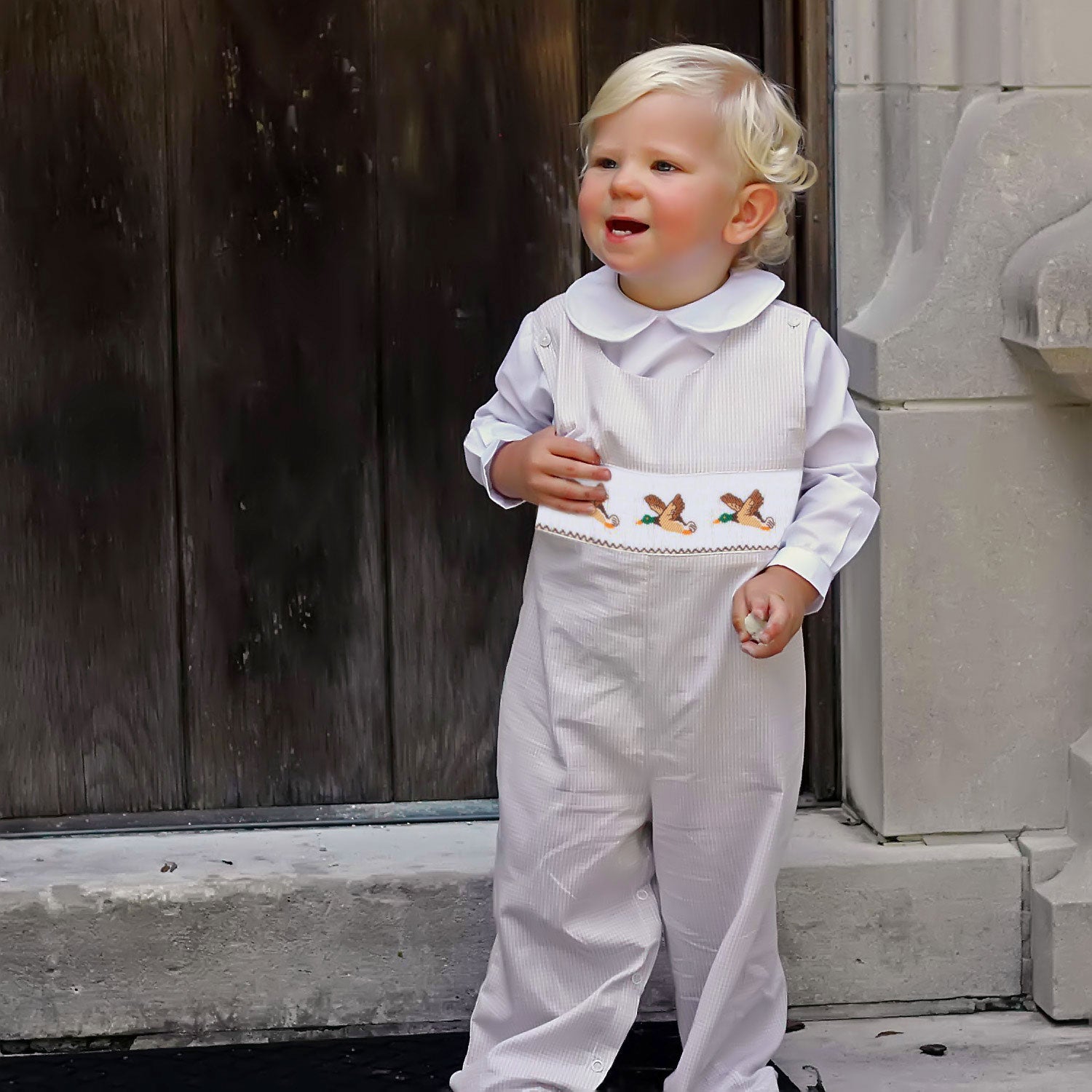 Pair this longall with a short or long sleeve undershirt and enjoy all Fall long! Mallard smocking on a tan gingham background. Snaps in stride.