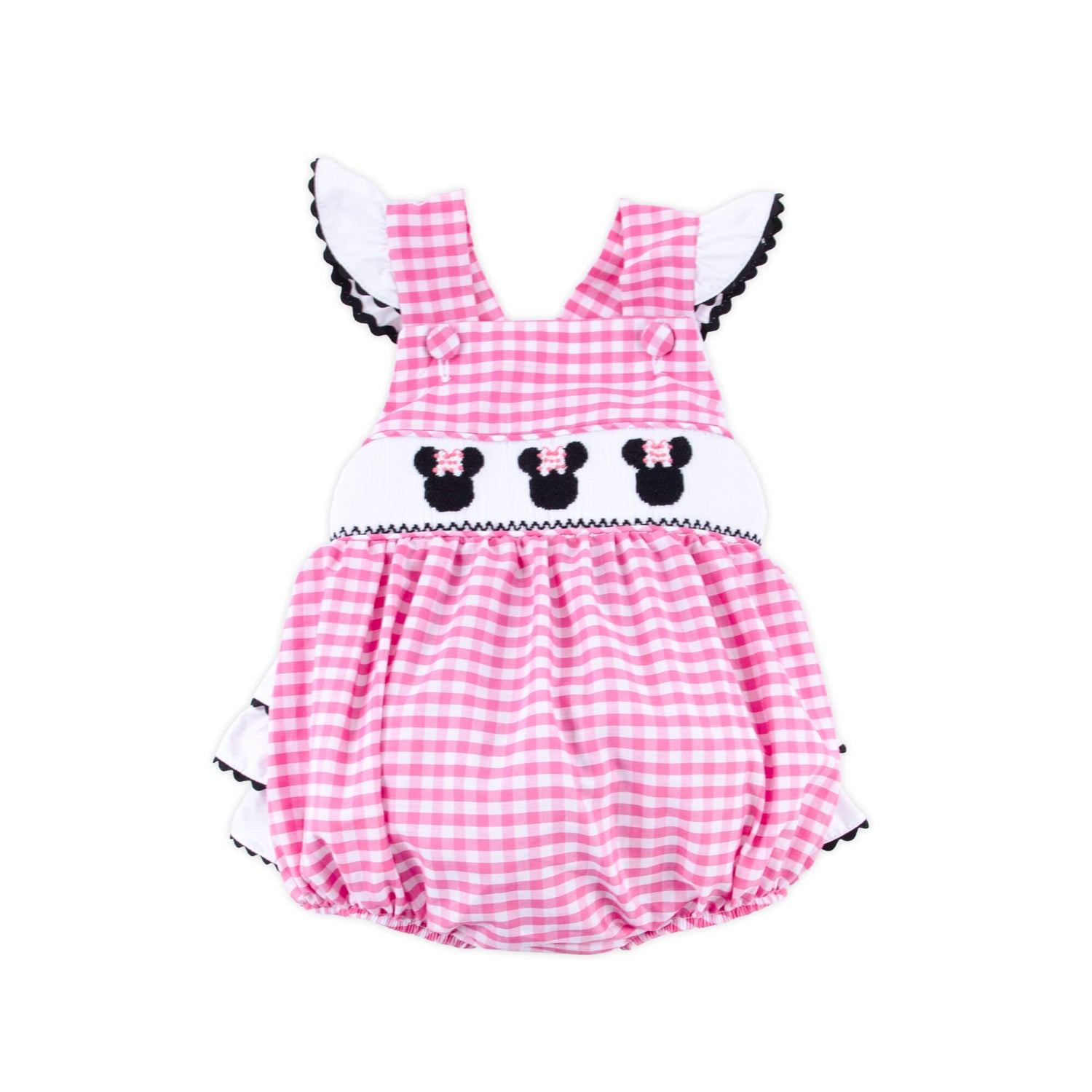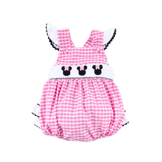 This Mouse Ears Smocked Pink Leah Bubble is perfect for your little girl all season long! Designed in pink gingham, it features smocked mouse ears, flutter sleeves trimmed in black ric-rac, and sweet white ruffles along the cross-back straps. Snaps in stride for easy changes.