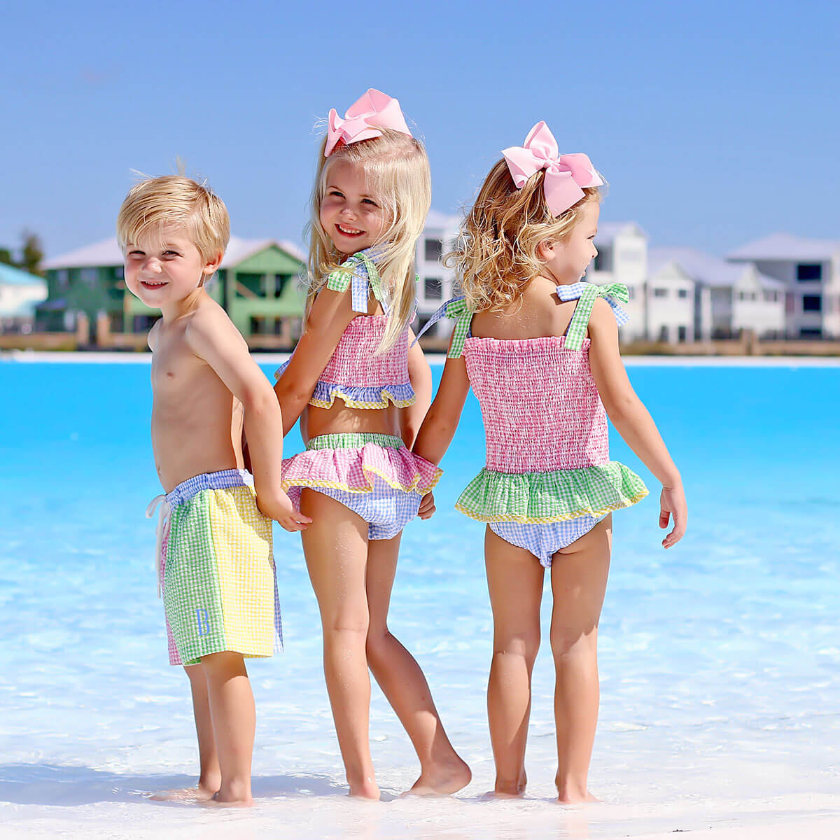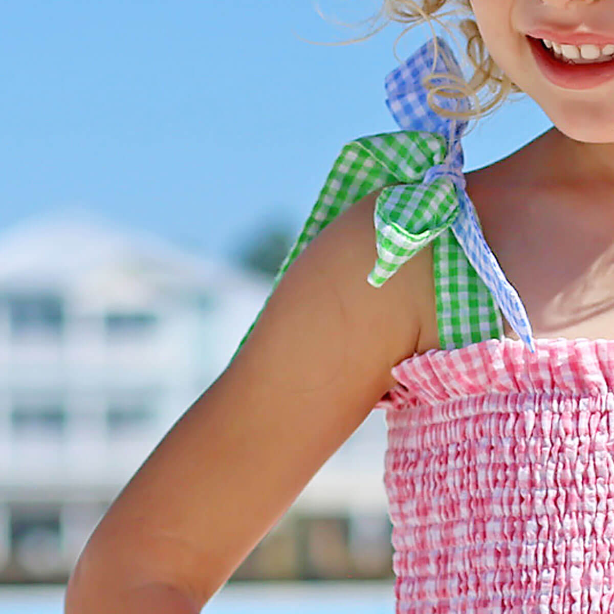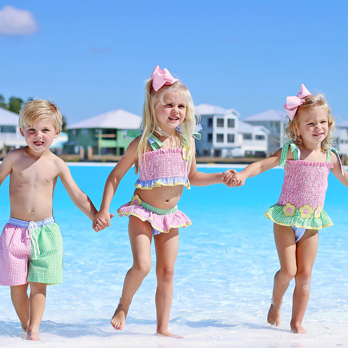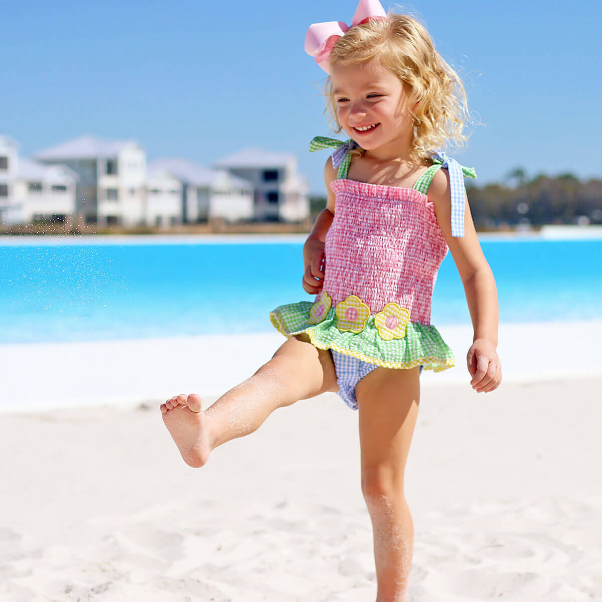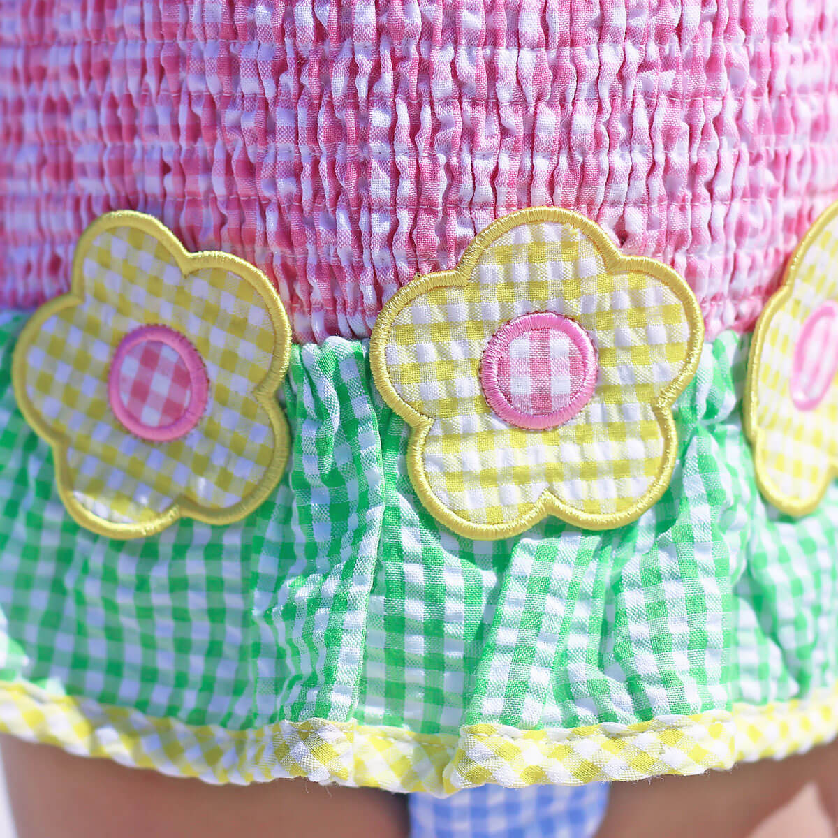 Make a statement this summer in our adorable Multi Seersucker Daisy Swimsuit. It is made with a cotton blend seersucker and features color blocking, a smocked bodice, tie straps, a peplum skirt and cute daisy flowers.